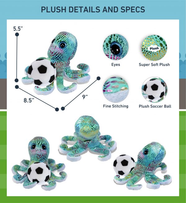 - The Stuffed Animal Octopus Comes With A Unique Design You Will Love – Have an exciting imaginary play with your little one and the octopus toy. DolliBu’s Big Eye Iridescent Rainbow Octopus will surely bring a smile to your loved ones who love ocean animals and soccer sports. A must-have toy for family bonding. Add cute stuffed animals for kids and adults, like the super cute and realistic octopus plush, to your ocean-themed room and decor.