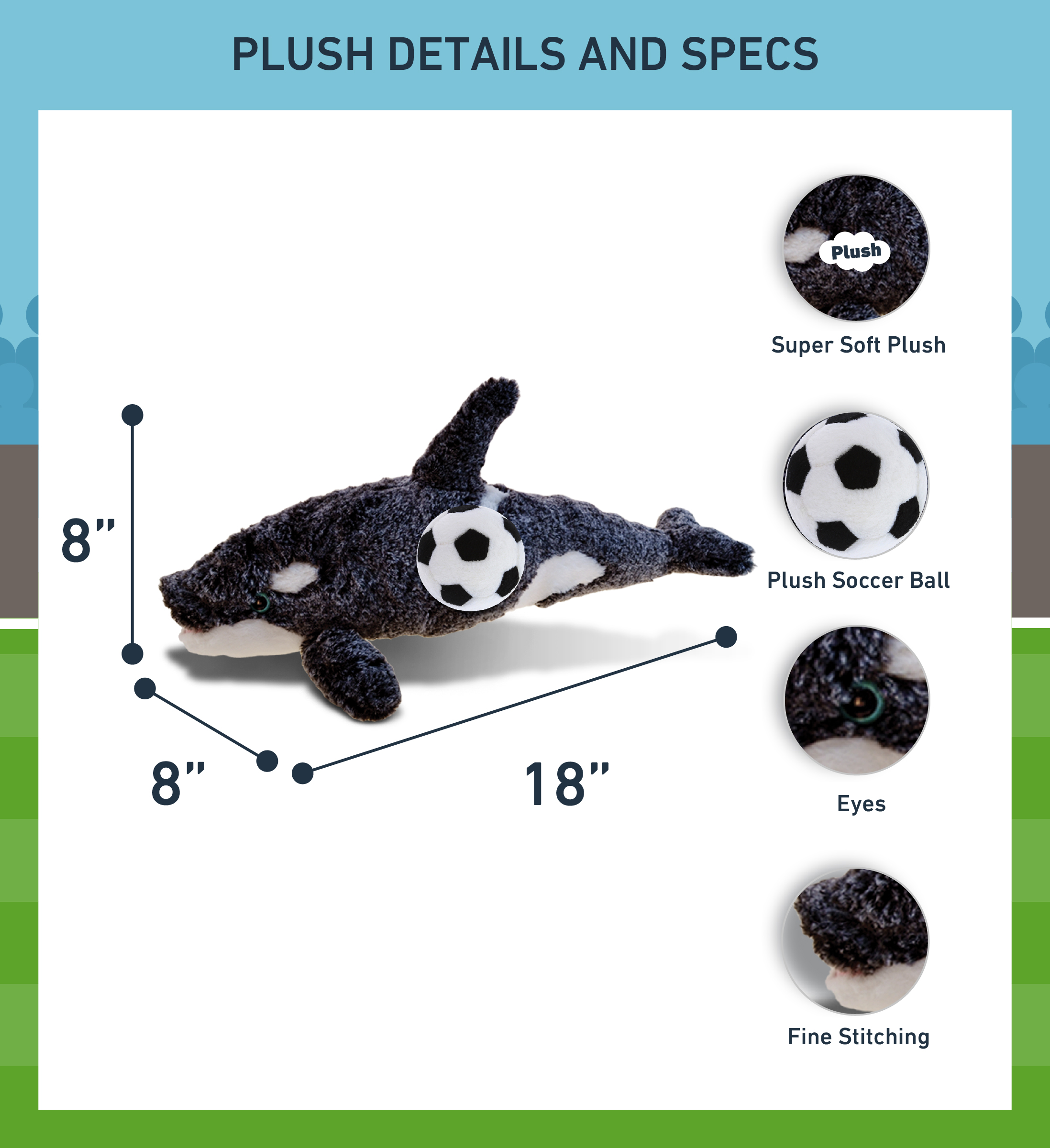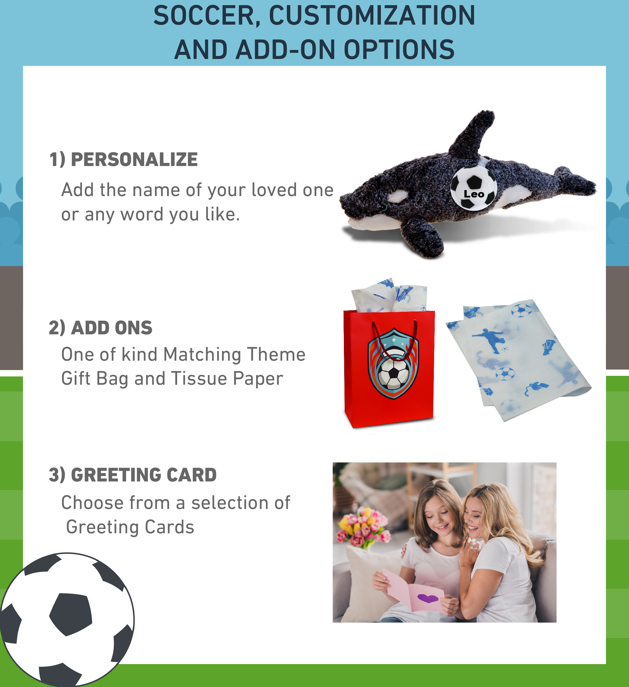 - PERSONALIZATION, CUSTOMIZATION, AND ADD-ON OPTIONS – Super Soft Sports Stuffed Animal Killer Whale comes customized with a Soccer Ball Plush. You can personalize it with the name of your loved one imprinted on the item. You also have the option to add some or all of the cool add-ons to make your gift extra special: 1) Gift Bag; 2) Tissue Paper; 3) Greeting Card.