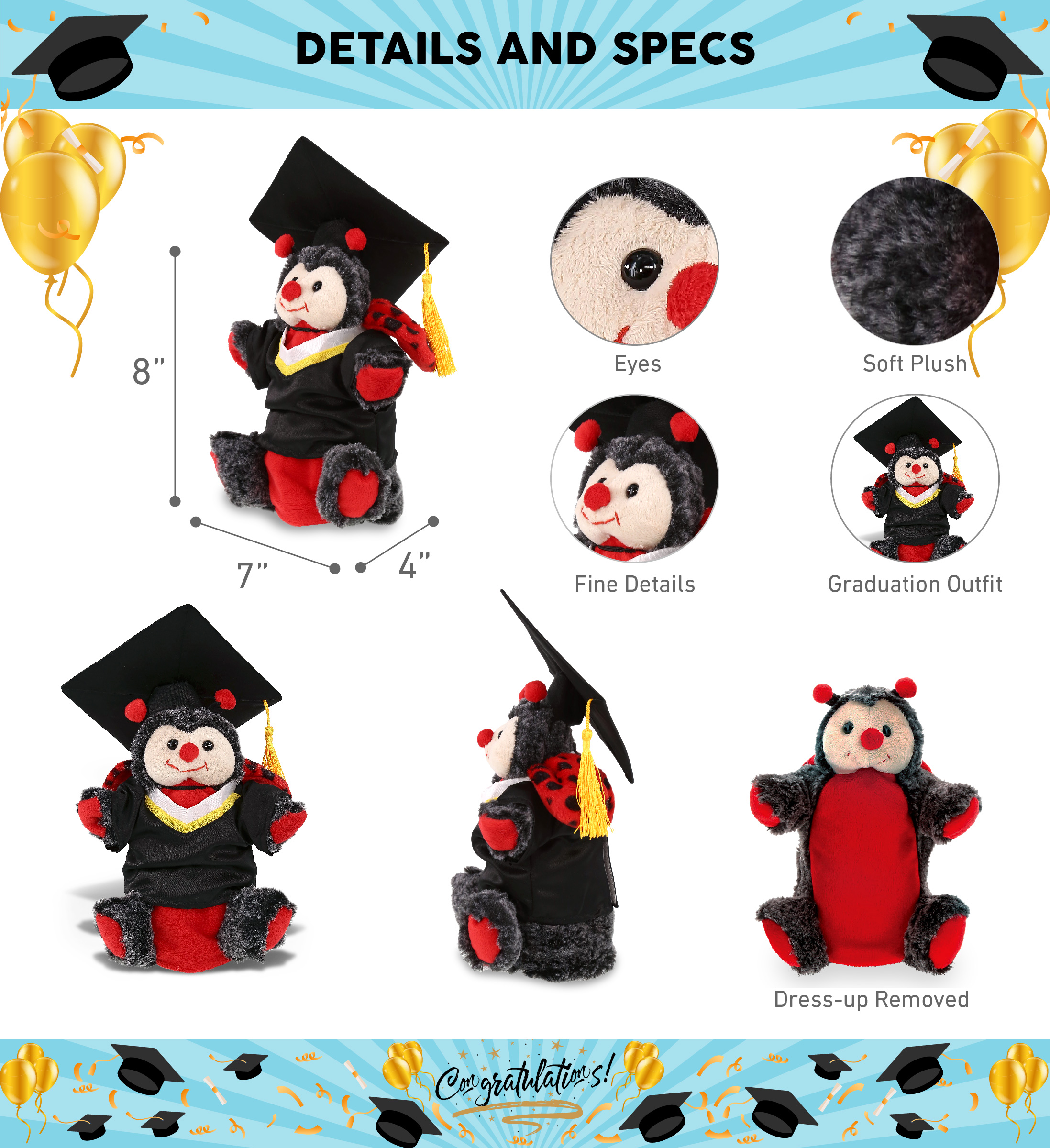 - THE LADYBUG GRADUATION TEDDY BEAR IS FOR ANYONE WHO LOVES CUTE STUFFED ANIMALS – Ladybug Graduation Bear Plush Hand Puppet with outfit designed with super soft fluffy plush, a sweet plush animal gift for your loved one who recently graduated from school or college! Congratulate your little one on achieving their dream and make the celebration extra special for the family. Makes a fun decorative souvenir plush stuffed animal for graduation day!