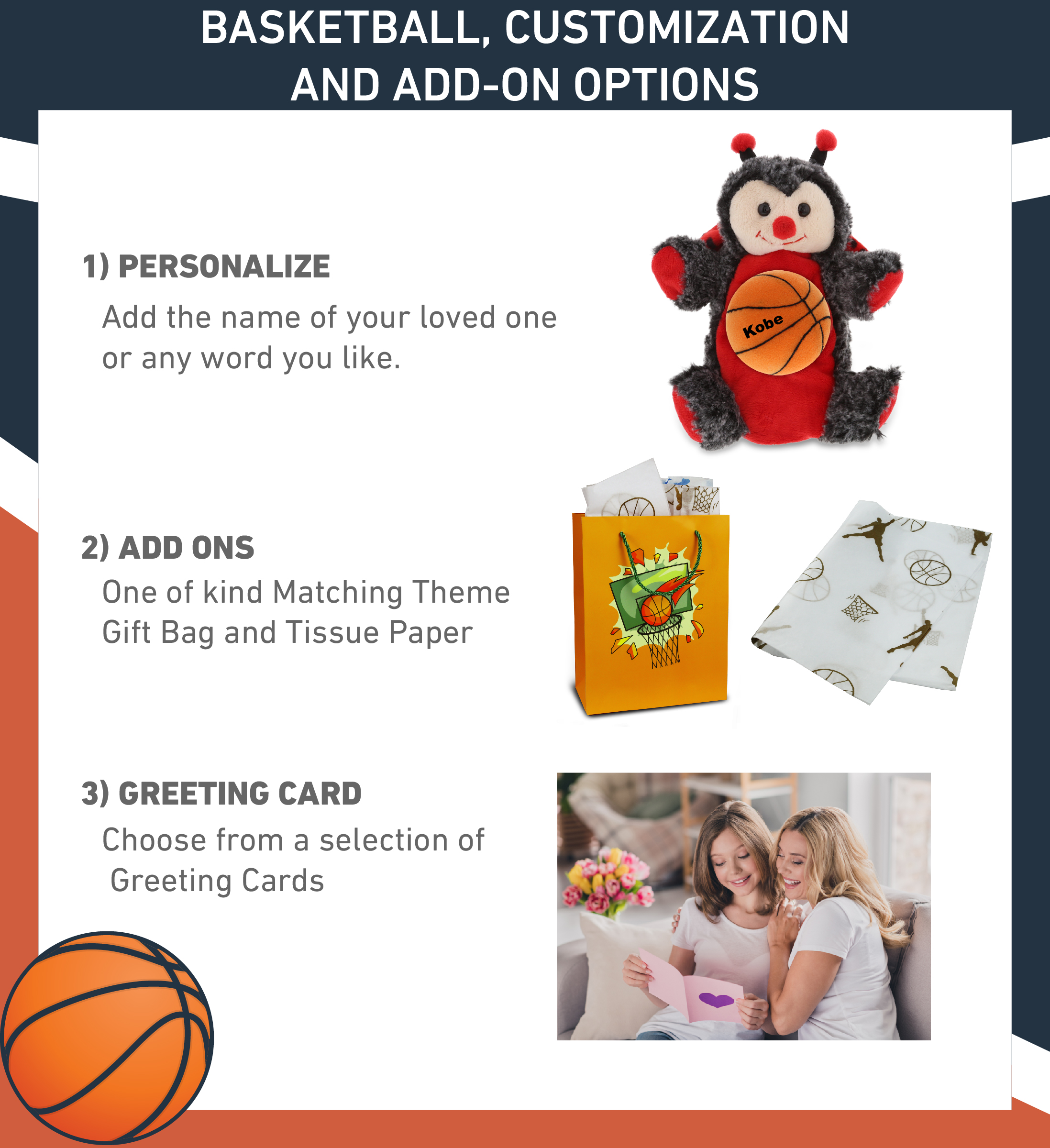 - Personalization, Customization, and Add-On Options – The Super Soft Sports Stuffed Animal Ladybug Hand Puppet comes customized with a Basketball Plush. You can personalize your ladybug plush toy with the name of your loved one, which we will imprint on the item. You also have the option to add some or all of the cool add-ons to make your plush gift extra special: 1) Gift Bag; 2) Tissue Paper; 3) Greeting Card.