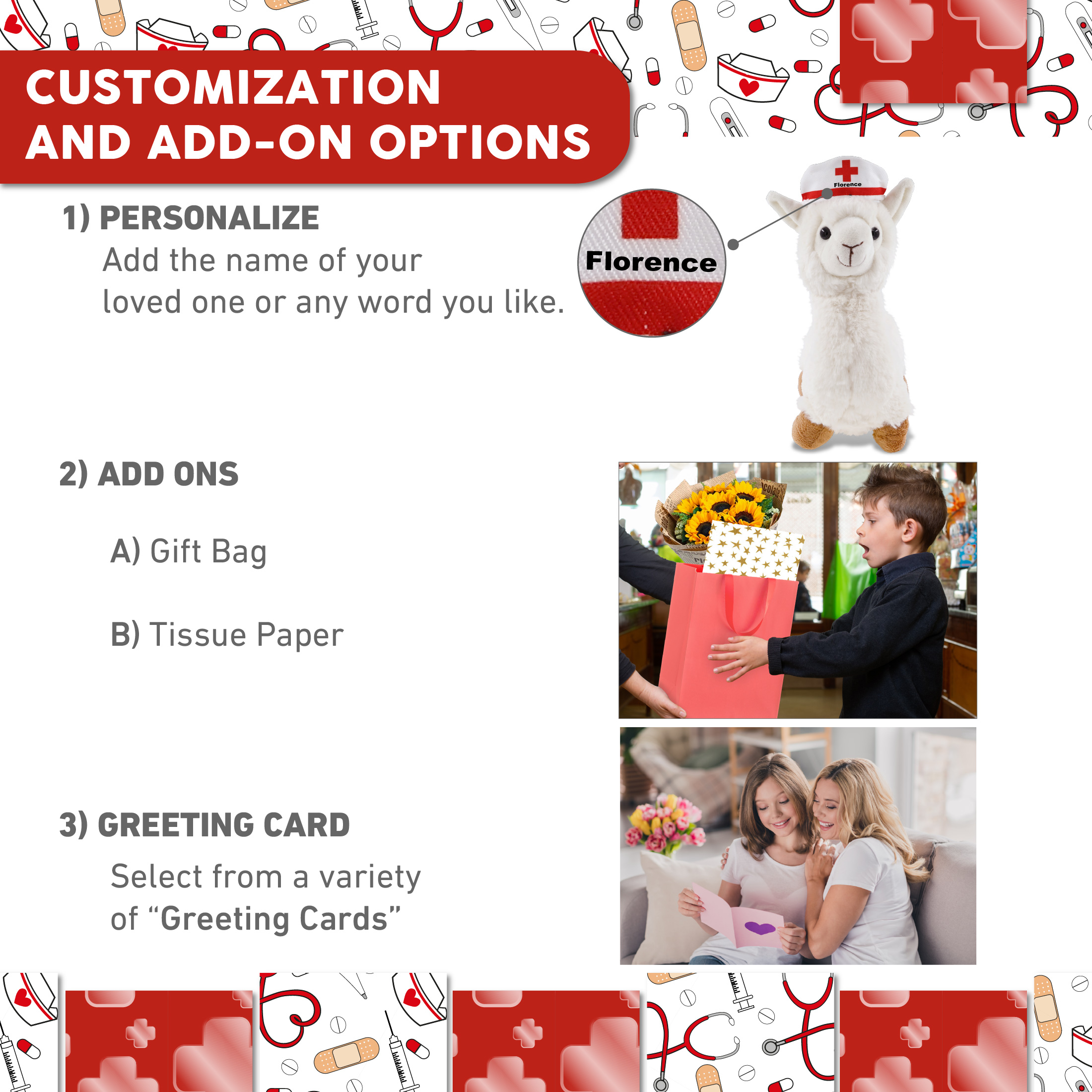 - Personalization, Customization, and Add-On Options – The stuffed animal llama comes dressed in a cute nurse cap. Make your nurse teddy bear stuffed animal plush special by adding a personalized name, which we’ll imprint onto the llama plush. You can also customize your stuffed animal nurse llama plush by adding any of our add-ons to create the perfect gift: 1) Gift Bag 2) Tissue Paper 3) Greeting Card.