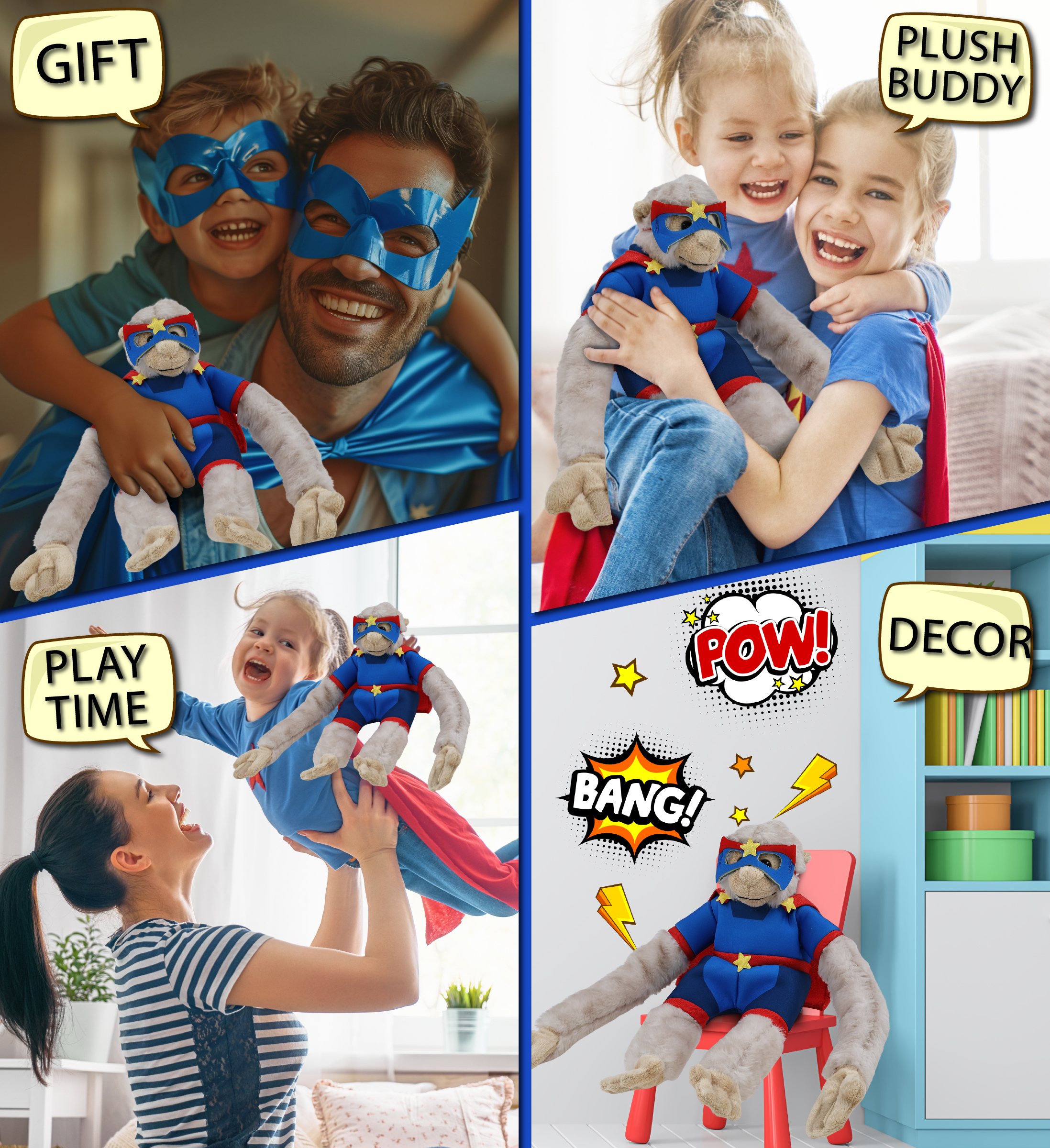 - Made of High-Quality Soft Polyester – The Superhero Stuffed Animal Clothes outfit and the monkey plush doll are made with super-soft, durable, premium-quality polyester materials. This cute dress up plush monkey is designed for everyday hugs and creative dress-up fun, blending superhero style with silly animal charm. The superhero monkey plush toy outfit includes a hook and loop tape fastener on the back of the suit for quick and easy dressing.