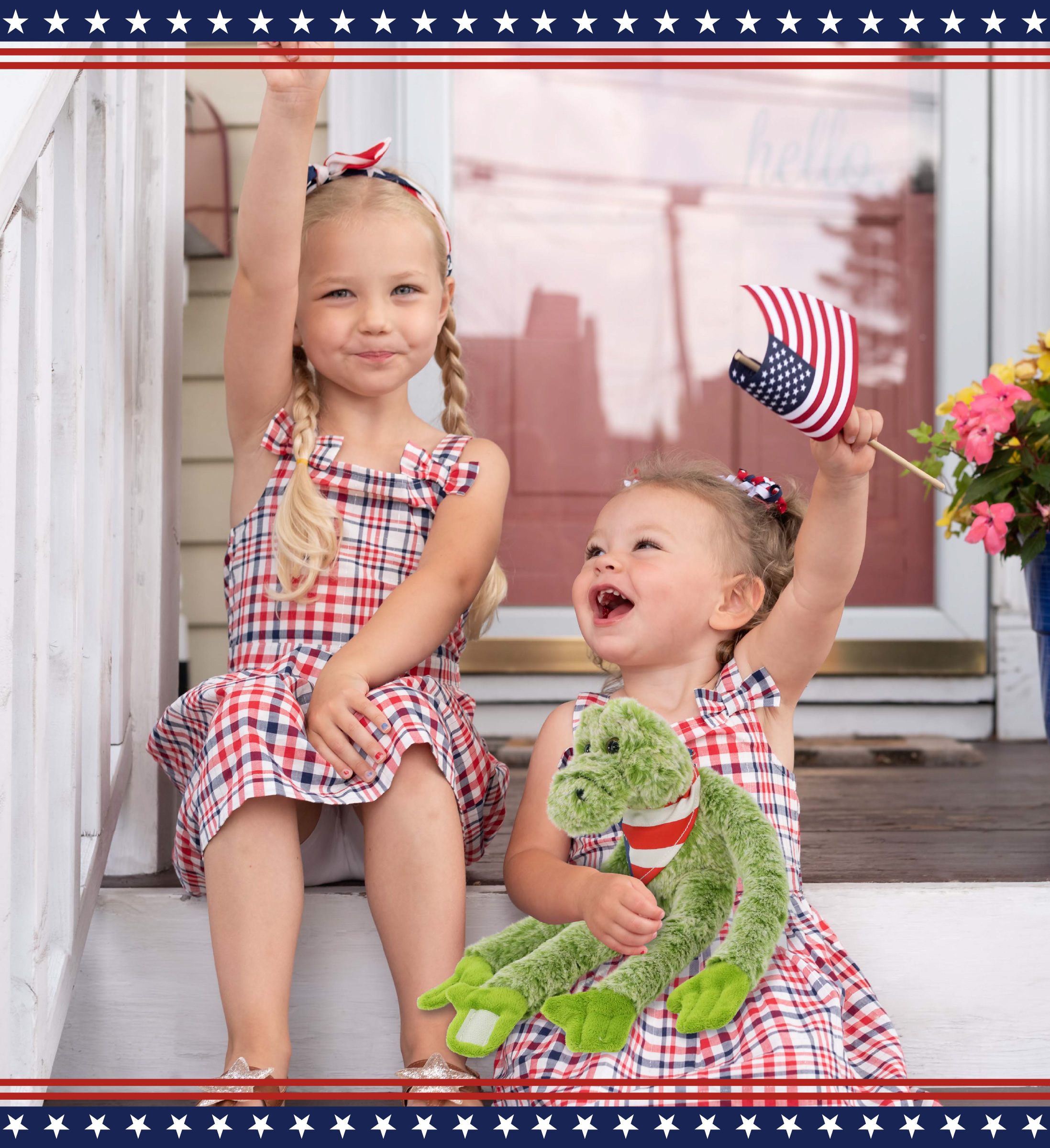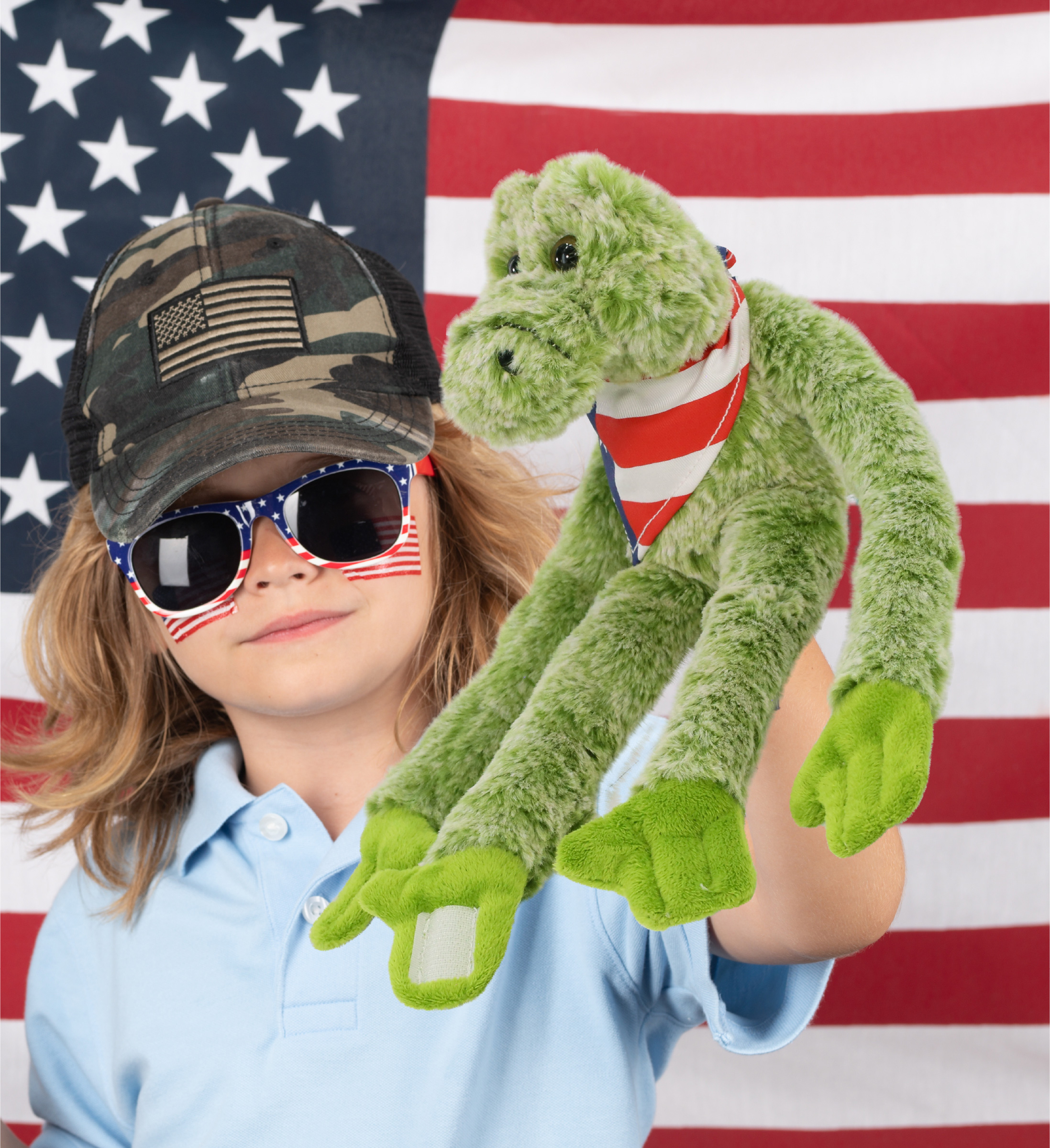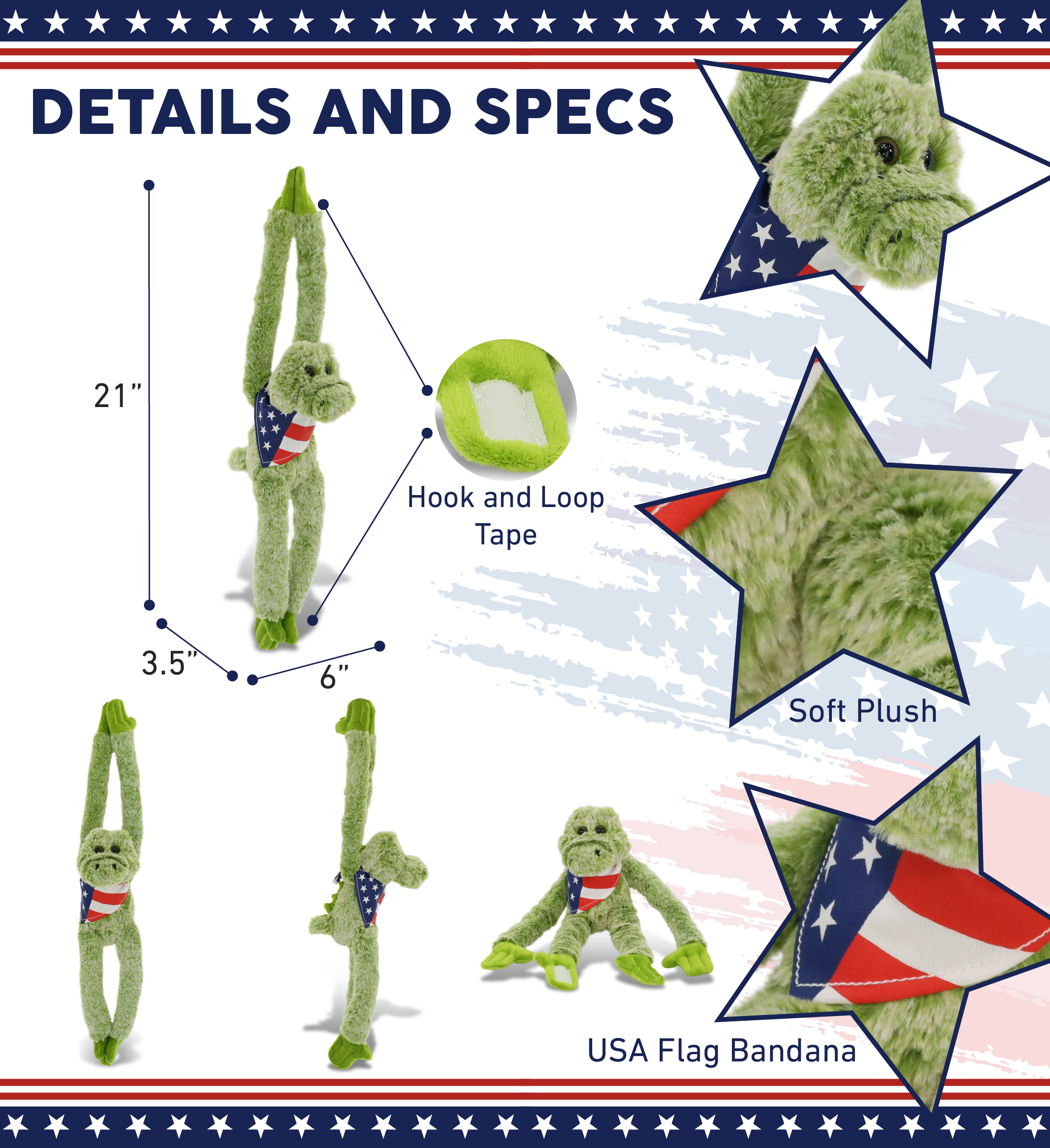- Includes 1 DolliBu Long Arms Alligator Toy with USA Flag Bandana Dress Up Set – The stuffed animal alligator arrives with a removable red, white and blue USA flag bandana, making it a standout among stuffed animals with clothes. Turn your classic teddy bear alligator into collectible patriotic stuffed animal perfect for celebrating USA holidays. The alligator stuffed animal measures 21Lx6Wx3.5H inches and is for kids ages 0 and up.