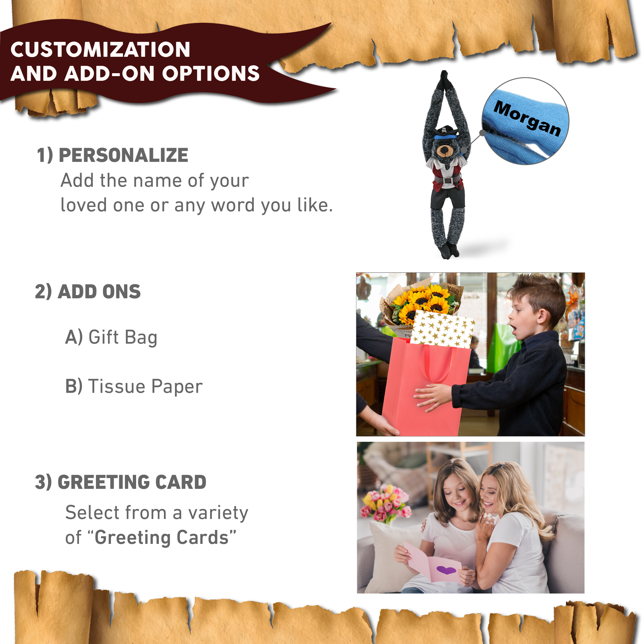 - Personalization, Customization, and Add-On Options – The bear figure stuffed toy comes dressed in full pirate clothes, complete with pirate hat, pirate vest, pirate shirt, pants, belt, and pirate mask. Make your bear doll special by adding a personalized name, which we will imprint onto the plush. You can also customize your stuffed animal by adding any of our add-ons to create the perfect gift: 1) Gift Bag 2) Tissue Paper 3) Greeting Card.