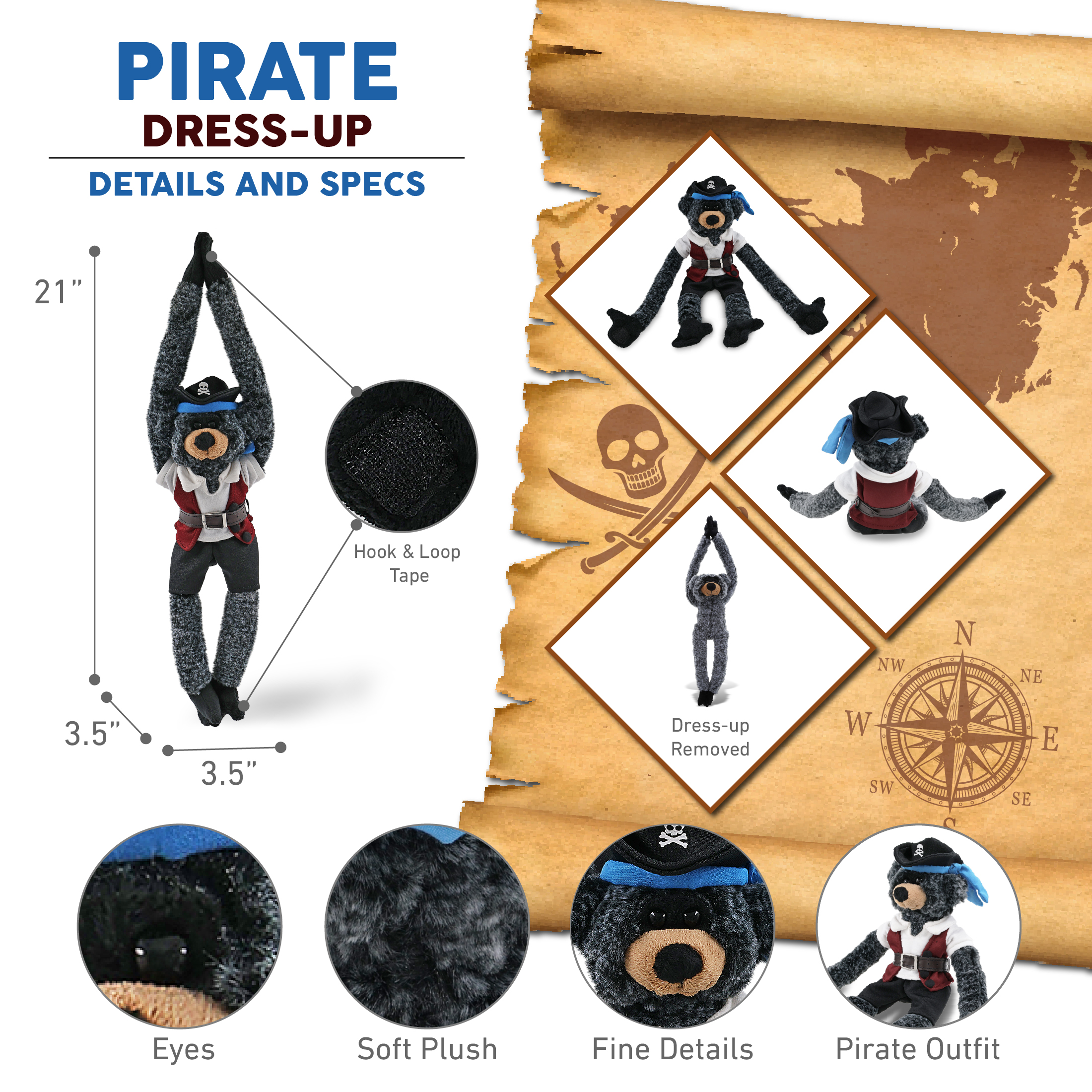 - Includes 1 DolliBu Long Arms Black Bear Stuffed Toy with Pirate Outfit – The bear toy wears a pirate teddy bear costume featuring a pirate vest, belt, shirt, pants, and pirate hat. Whether you’re collecting bear toys or hunting for pirate stuff for kids, this plush is the perfect combo of silly plush fun and dress-up adventure. This cute pirate stuffed animal bear measures approximately 21Lx3.5Wx3.5H inches and is for kids ages 3 and up.