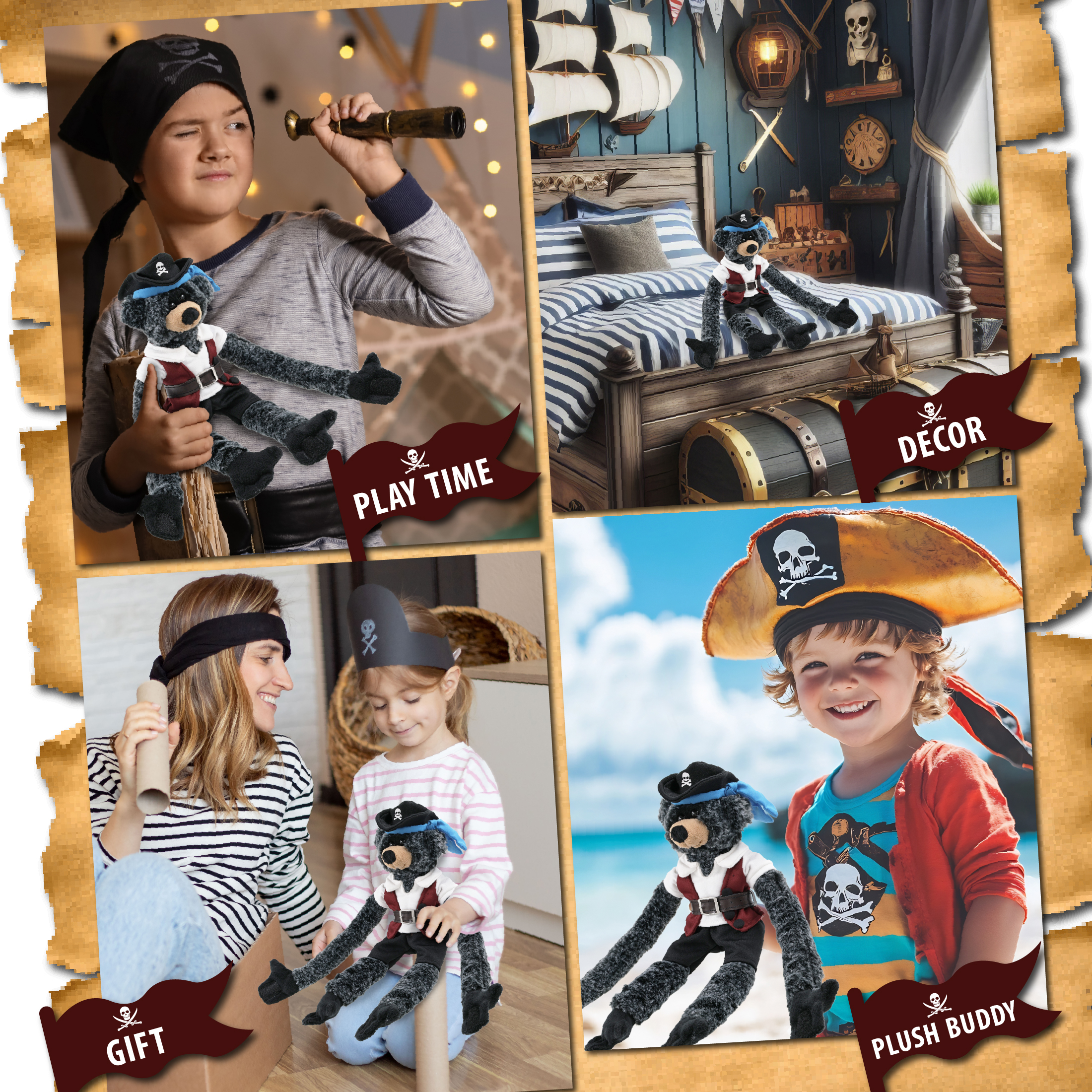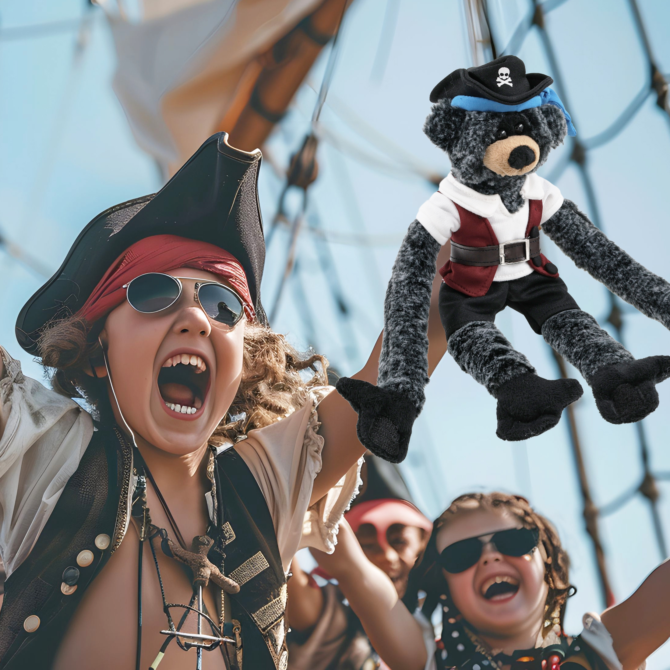 - The Pirate-Themed Long Arms Black Bear Stuffed Animal Features a Fun Mix of Pirate Vibes and Classic Bear – Making it both quirky and lovable. It comes with a complete head-to-toe pirate teddy bear outfits, featuring a hat with skull print and a blue bandana, a red vest, black pants, brown belt, white shirt, and an eye patch, making your cute Long Arms Black Bear a complete pirate, ready for some wild animal sea pirate adventure