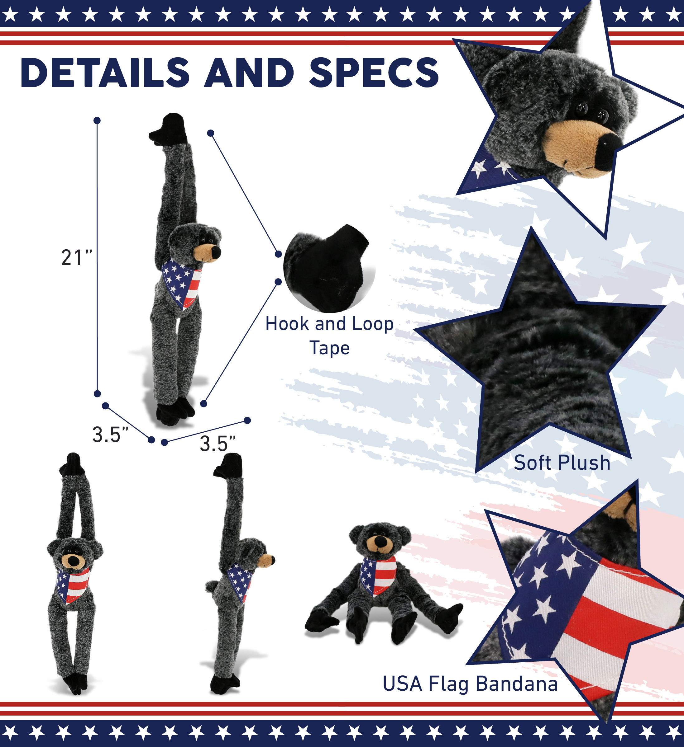 - Includes 1 DolliBu Long Arms Black Bear Toy with USA Flag Bandana Dress Up Set – The stuffed animal black bear arrives with a removable red, white and blue USA flag bandana, making it a standout among stuffed animals with clothes. Turn your classic teddy bear black bear into collectible patriotic stuffed animal perfect for celebrating USA holidays. The black bear stuffed animal measures 21Lx3.5Wx3.5H inches and is for kids ages 0 and up.