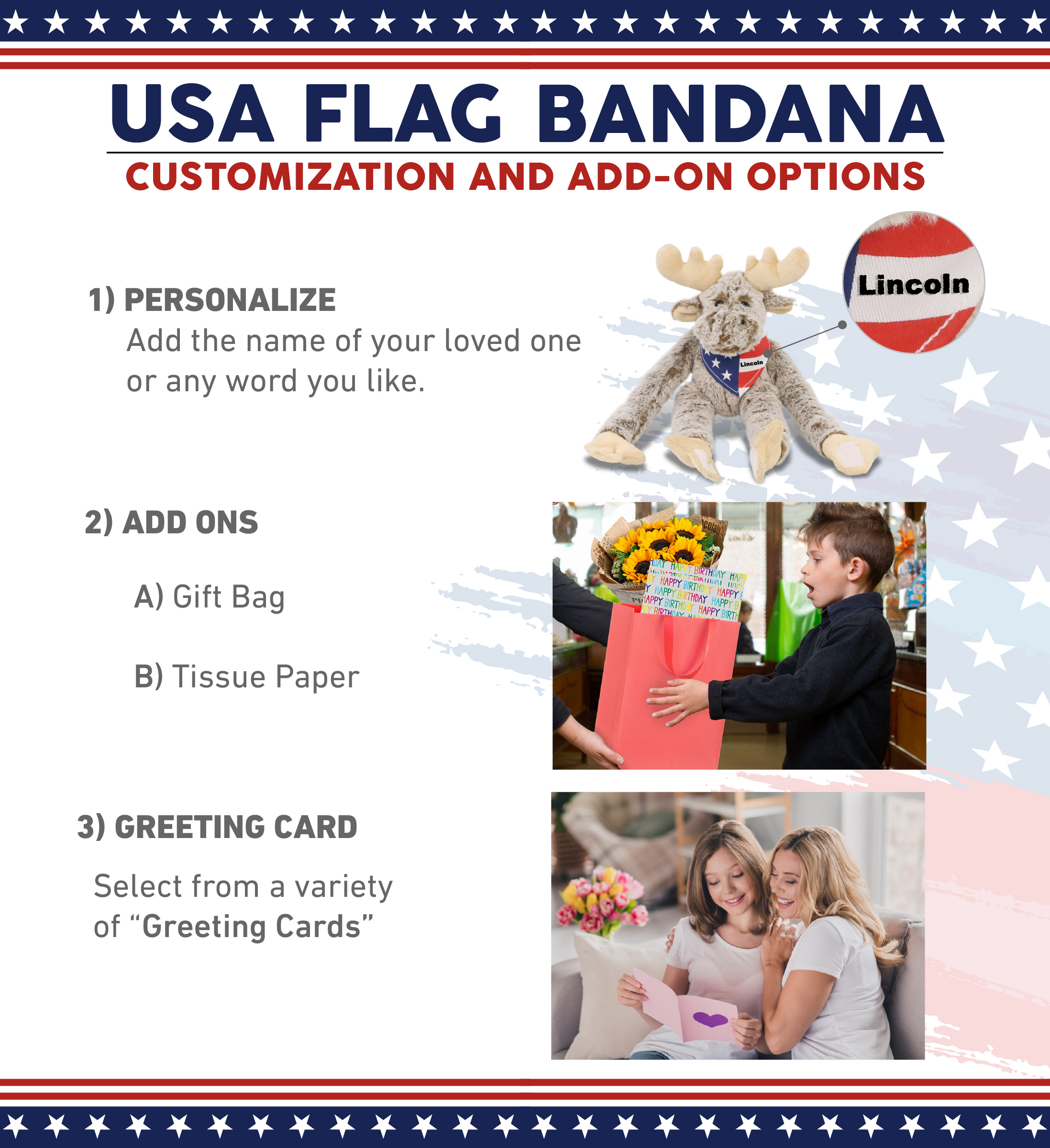 - Personalization, Customization, and Add-On Options – The stuffed moose plush toy comes dressed with a removable USA Flag Bandana to give a unique patriotic twist. Make the plush moose toy cool and unique by personalizing it with the name, which we will imprint directly onto the plush. You can also customize your plush moose by adding any of our add-ons to create the perfect gift: 1) Gift Bag 2) Tissue Paper 3) Greeting Card.