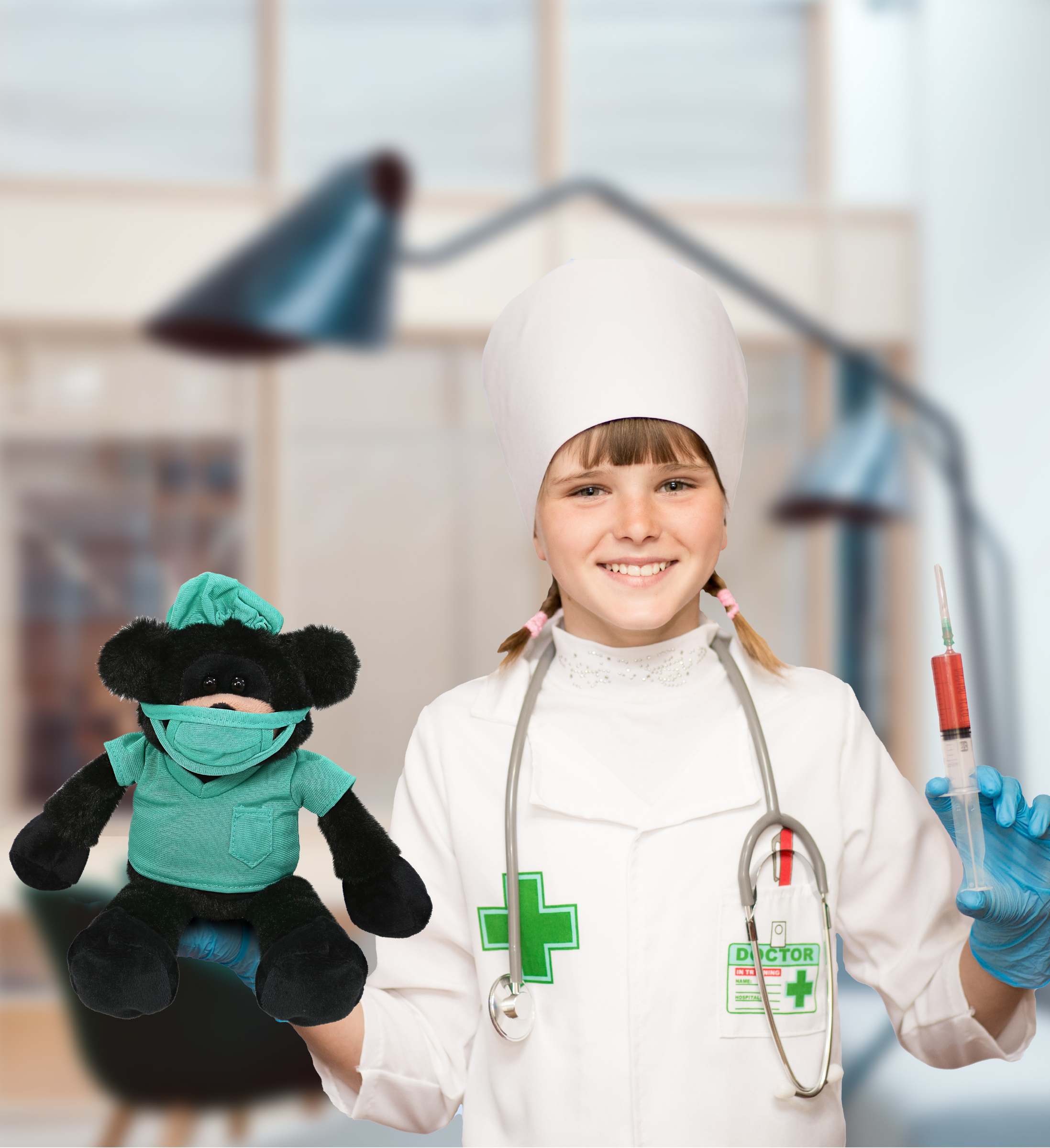 - INCLUDED WITH THE PURCHASE – Includes 1 Super Soft Long Leg Black Bear Plush Toy in a doctor’s uniform. The adorable Bear plush animal wears a doctor’s uniform shirt blue-green scrub suit with a face mask and scrub cap. The green scrub cap complements the stuffed toy’s uniform. The body is made of soft fabric and fluffy plush that makes the Bear doctor perfect for cuddles and snuggles. This Bear doctor stuffed toy measures 3.5LX4WX10.5H inches.