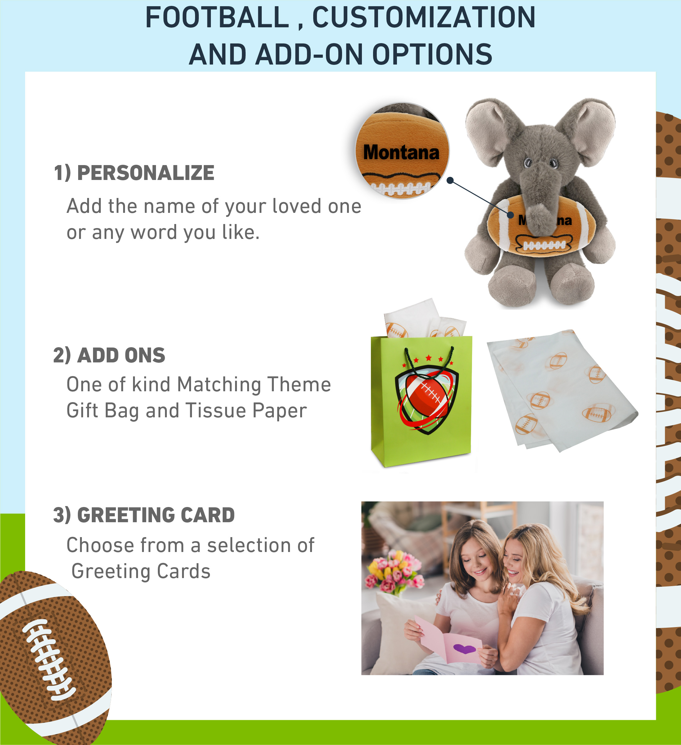 - PERSONALIZATION, CUSTOMIZATION, AND ADD-ON OPTIONS – Super Soft Sports Stuffed Animal Long Leg Elephant comes customized with a Football Plush. You can personalize it with the name of your loved one imprinted on the item. You also have the option to add some or all of the cool add-ons to make your gift extra special: 1) Gift Bag; 2) Tissue Paper; 3) Greeting Card.