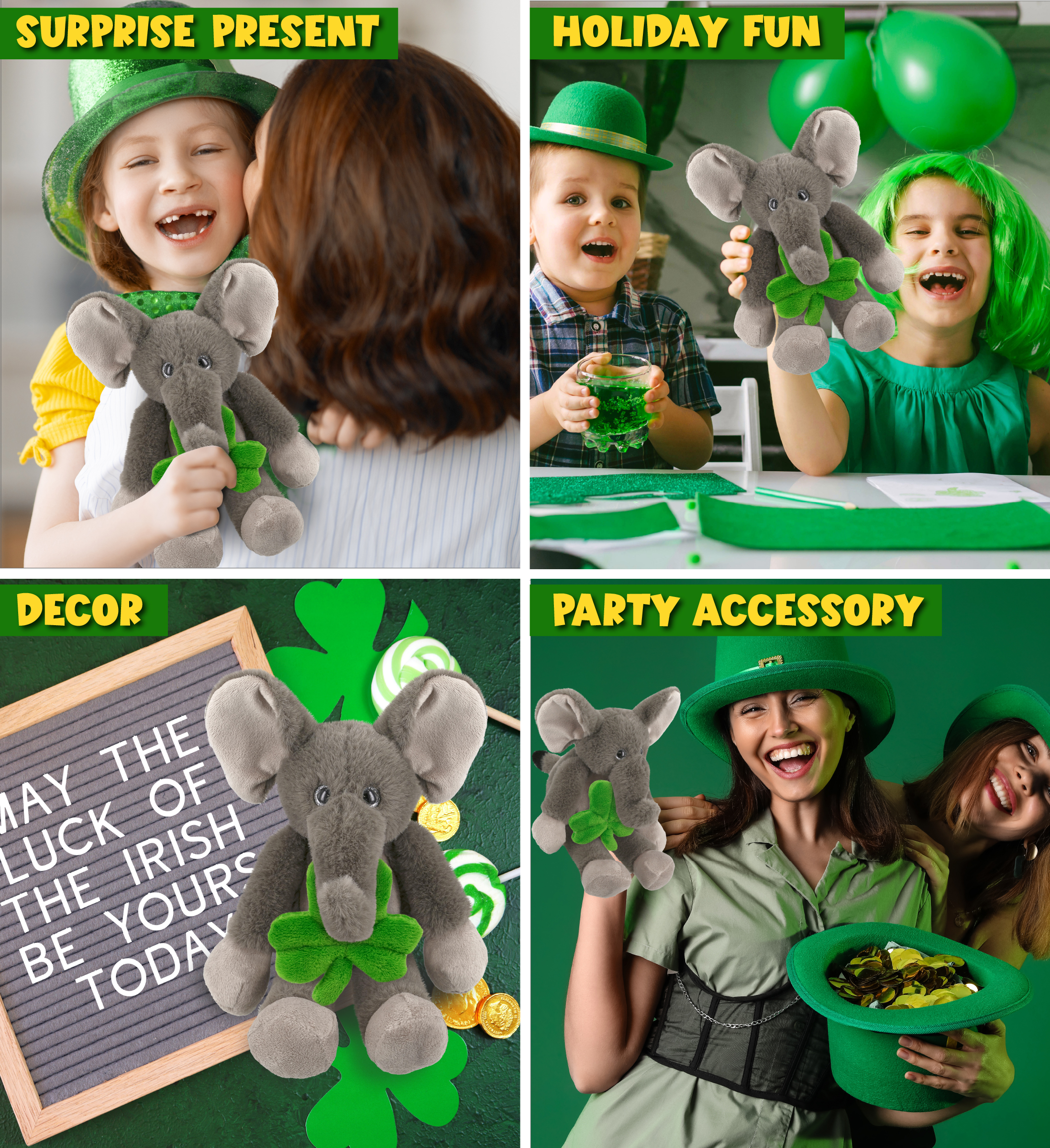 - THE SHAMROCK PLUSH ELEPHANT IS FOR EVERYONE WHO LOVES STUFFED ANIMALS – Soft plush stuffed animal Long Leg Elephant toy with an Irish shamrock is for everyone looking for cute stuffed animals to celebrate St Patricks Day. Perfect for Saint Patricks Day decor or cool prizes on St Patricks Day Games. Let the good and fun times roll with this elephant with a green plush shamrock; cute green St Patricks Day Gift to give this festive season.