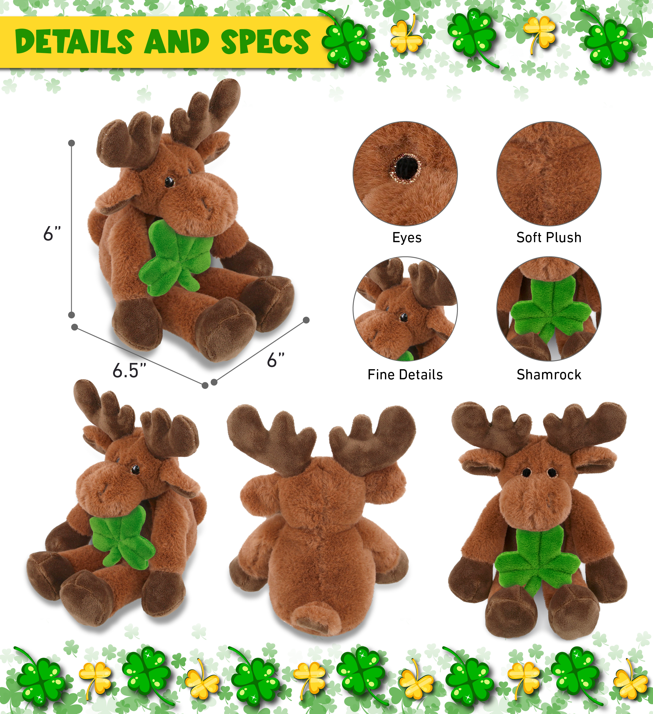 - THE SHAMROCK PLUSH MOOSE IS FOR EVERYONE WHO LOVES STUFFED ANIMALS – The soft plush stuffed animal Long Leg Moose toy with an Irish shamrock is for everyone looking for cute stuffed animals to celebrate St Patricks Day. Perfect for Saint Patricks Day decor or cool prizes on St Patricks Day Games. Let the good and fun times roll with this moose with a green plush shamrock; cute green St Patricks Day Gift to give this festive season.