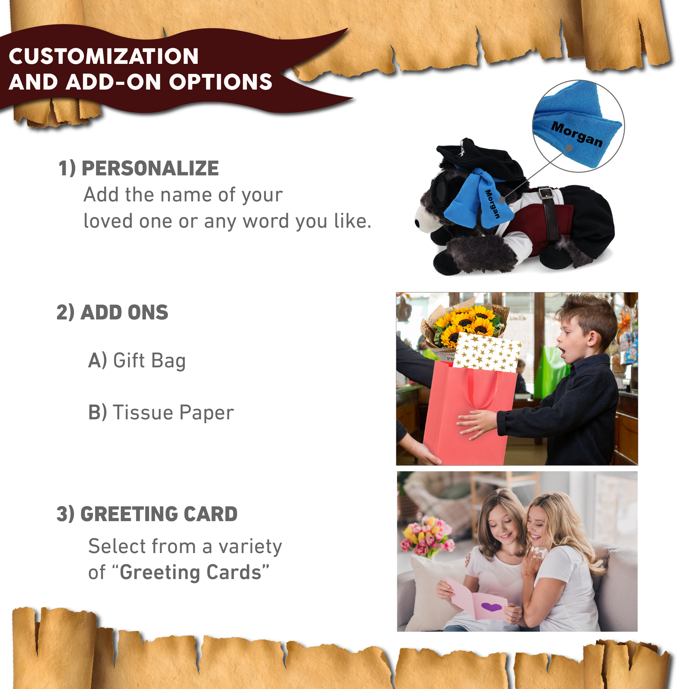 - Personalization, Customization, and Add-On Options – The horse figure stuffed toy comes dressed in full pirate clothes, complete with pirate hat, pirate vest, shirt, pants, belt, and pirate mask. Make your plush horse special by adding a personalized name, which we will imprint onto the plush. You can also customize your stuffed animal doll by adding any of our add-ons to create the perfect gift: 1) Gift Bag 2) Tissue Paper 3) Greeting Card.