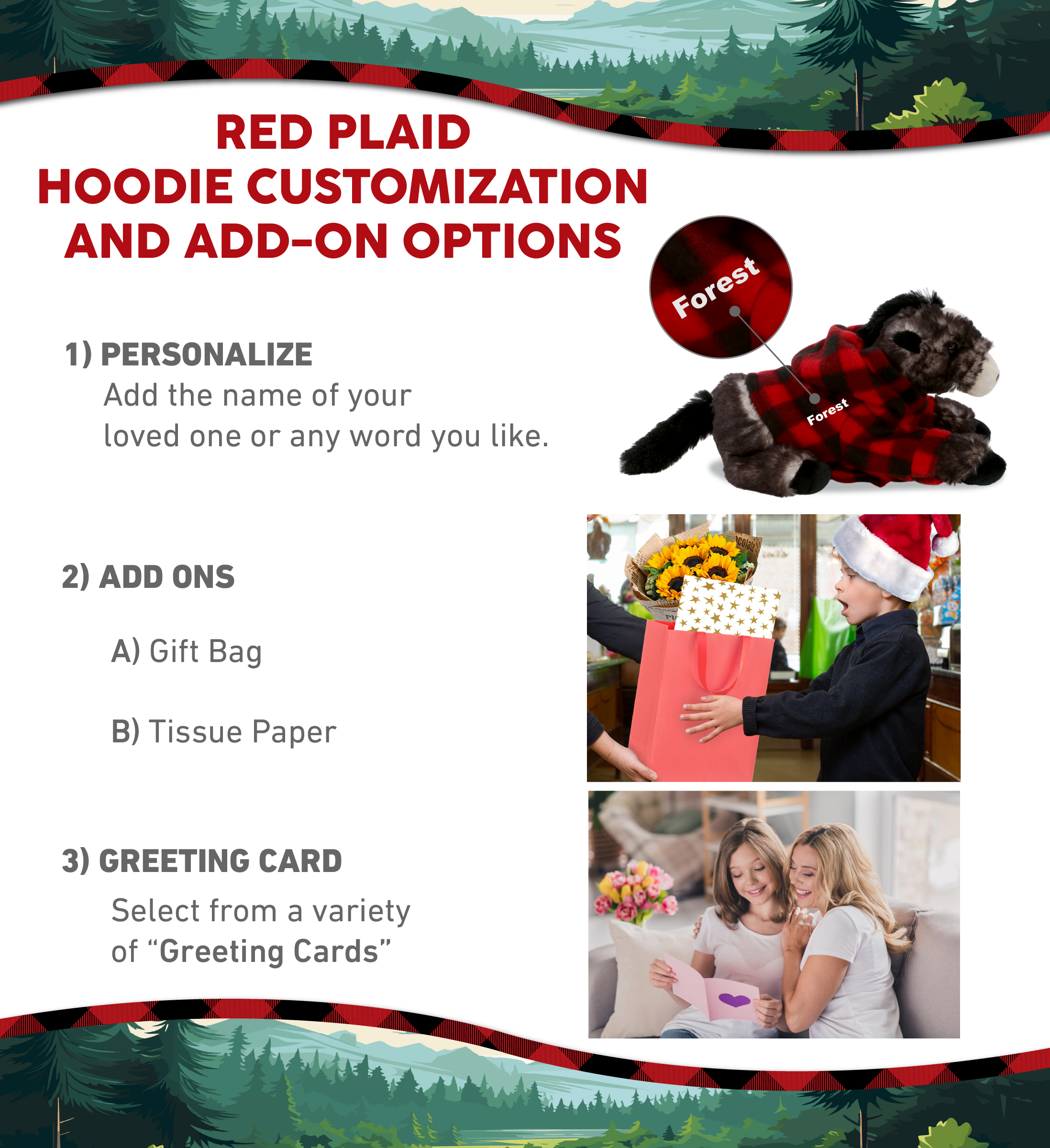 - PERSONALIZATION, CUSTOMIZATION, AND ADD-ON OPTIONS – The Soft Lying Black Horse Stuffed Animal comes dressed in a cozy teddy bear costume, a red plaid hoodie. Make your black horse plush more special by personalizing it with the name of your loved one, which we will print directly onto the plush. You can also customize your plush horse by adding any of our unique add-ons to create the perfect gift: 1) Gift Bag 2) Tissue Paper 3) Greeting Card.