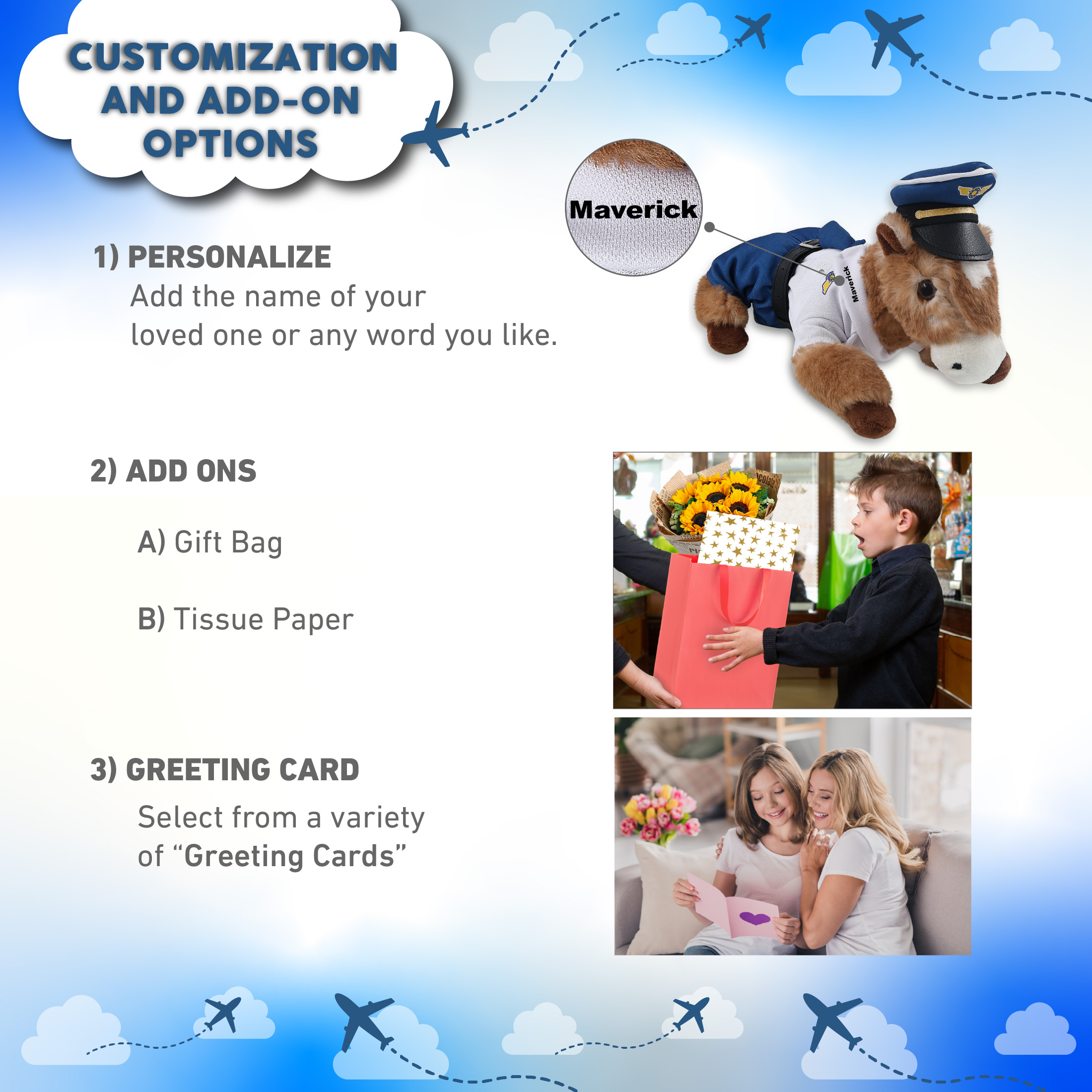 - Personalization, Customization, and Add-On Options – The horse stuffed animal comes dressed in a full pilot outfit set, with a white pilot shirt, captain hat, belt, and pants. Make your pilot stuffed bear special by adding a personalized name, which we will imprint onto the plush. You can customize your plush pilot toy by adding any of our add-ons to create the perfect gift: 1) Gift Bag 2) Tissue Paper 3) Greeting Card.