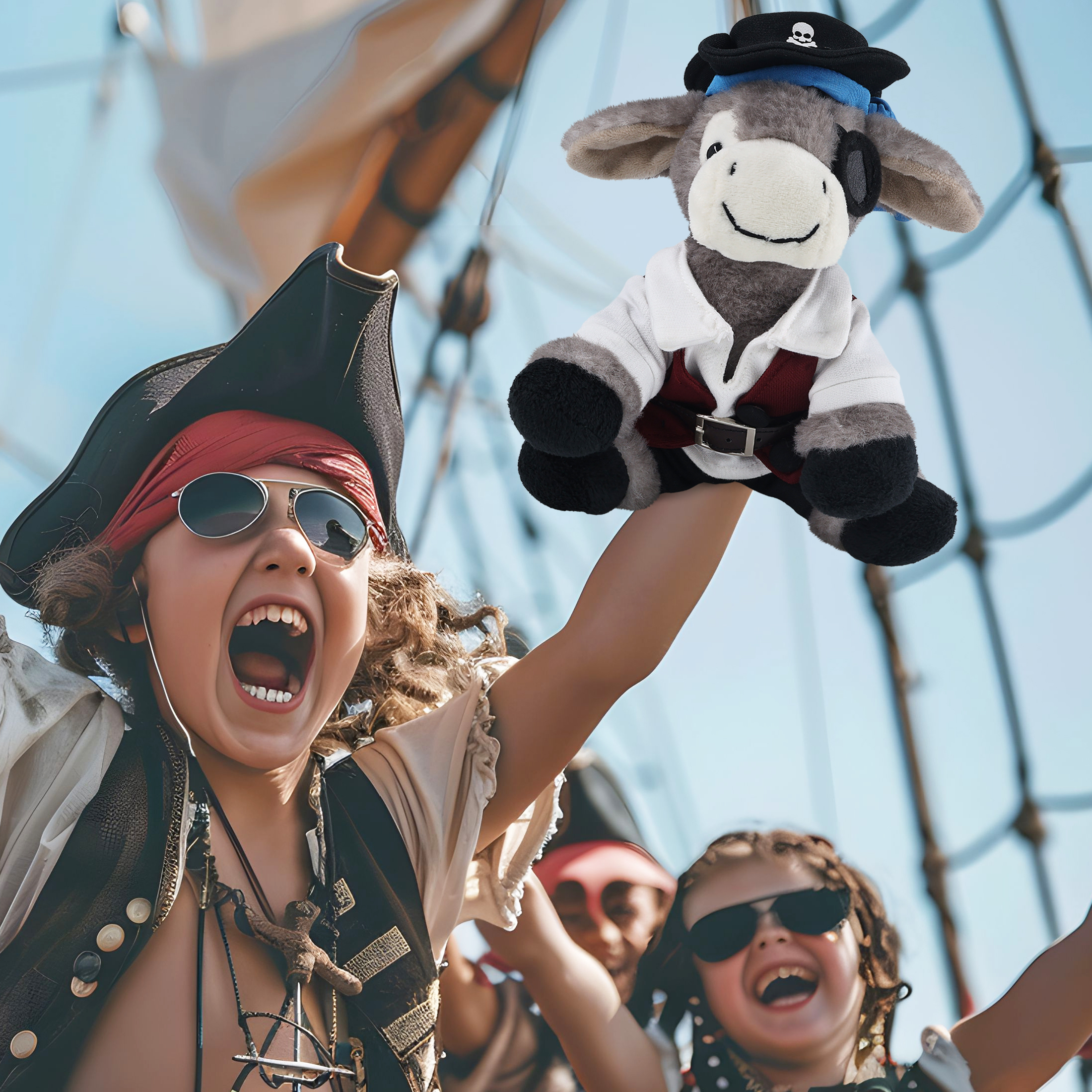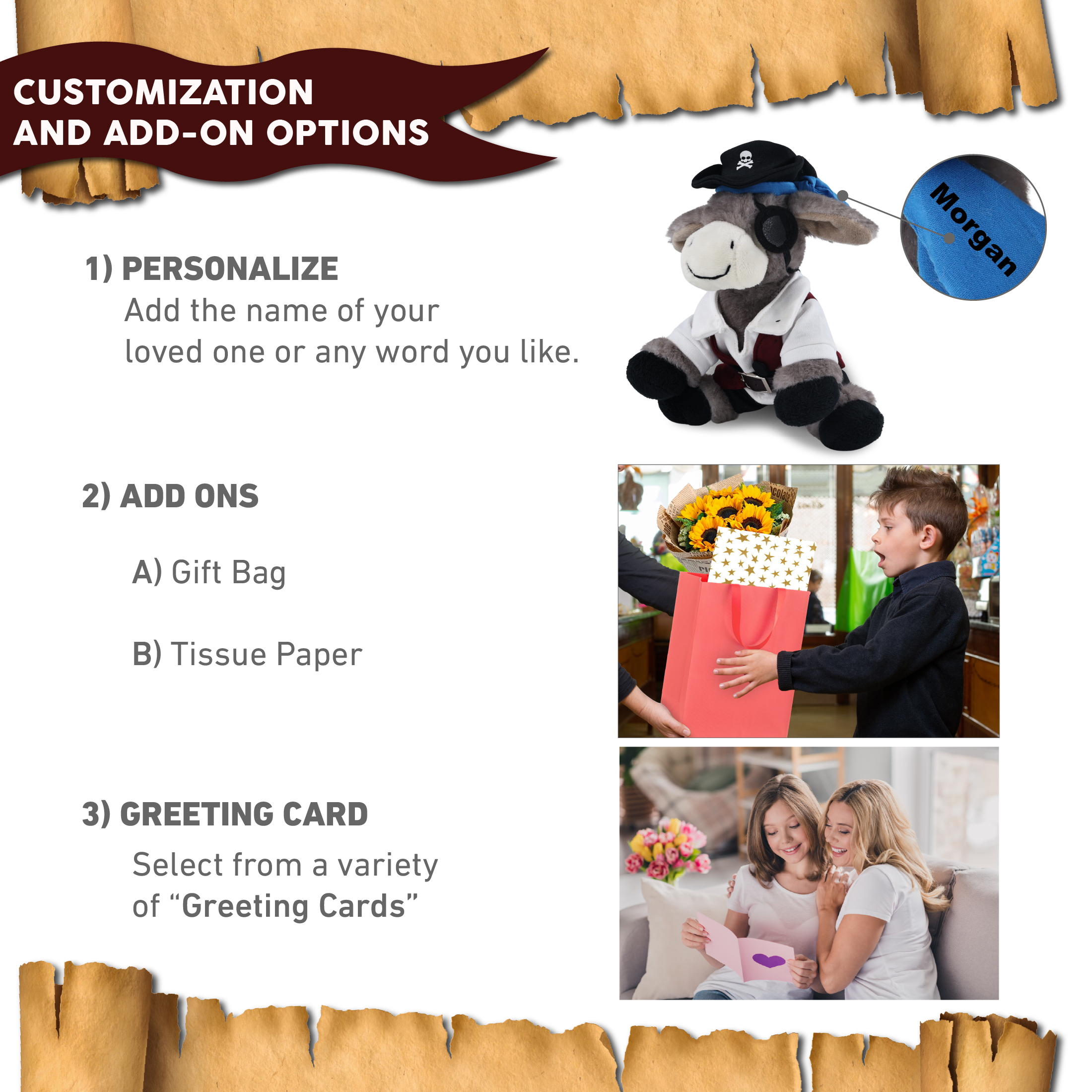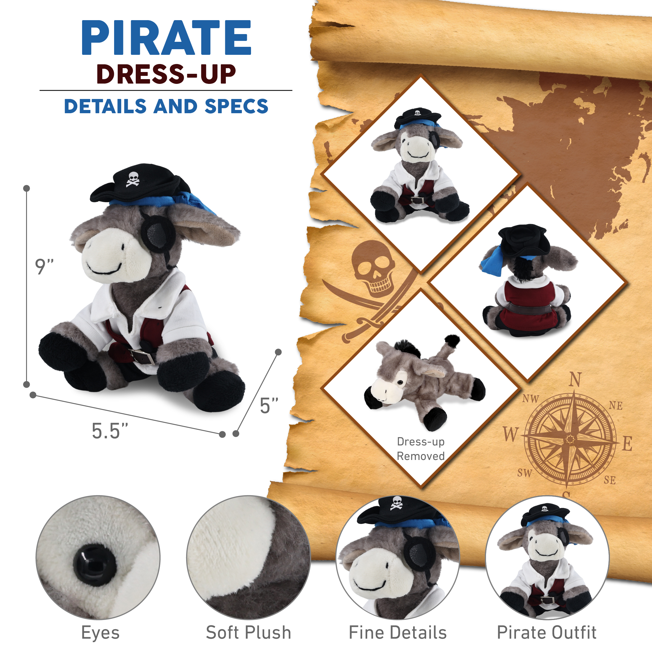 - Personalization, Customization, and Add-On Options – The donkey figure stuffed toy comes dressed in full pirate clothes, complete with pirate hat, pirate vest, shirt, pants, belt, and pirate mask. Make your plush donkey special by adding a personalized name, which we will imprint onto the plush. You can also customize your stuffed animal doll by adding any of our add-ons to create the perfect gift: 1) Gift Bag 2) Tissue Paper 3) Greeting Card.
