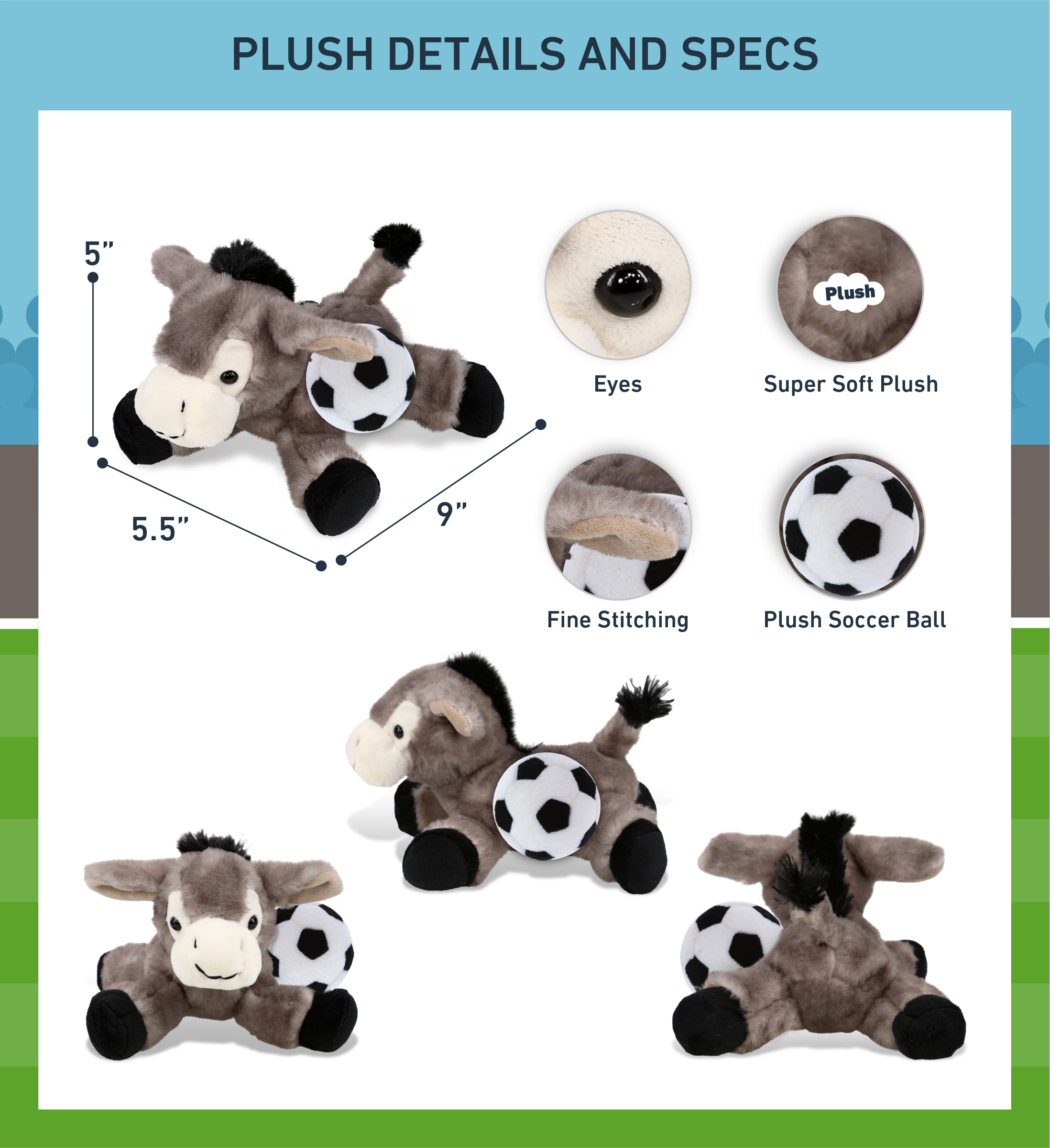 - Included with the Purchase of the Cute Super Soft Donkey Plush – Includes 1 DolliBu Lying Grey Donkey Super Soft Plush with a soccer ball plush, decorated with realistic features. The donkey’s body with a sports gift ball plush makes the plush perfect for cuddles. The donkey plush toy features details like its characteristic ears. The donkey’s eyes make the critter so charming. The cute, lying donkey plush toy buddy measures 9Lx5.5Wx5H inches.