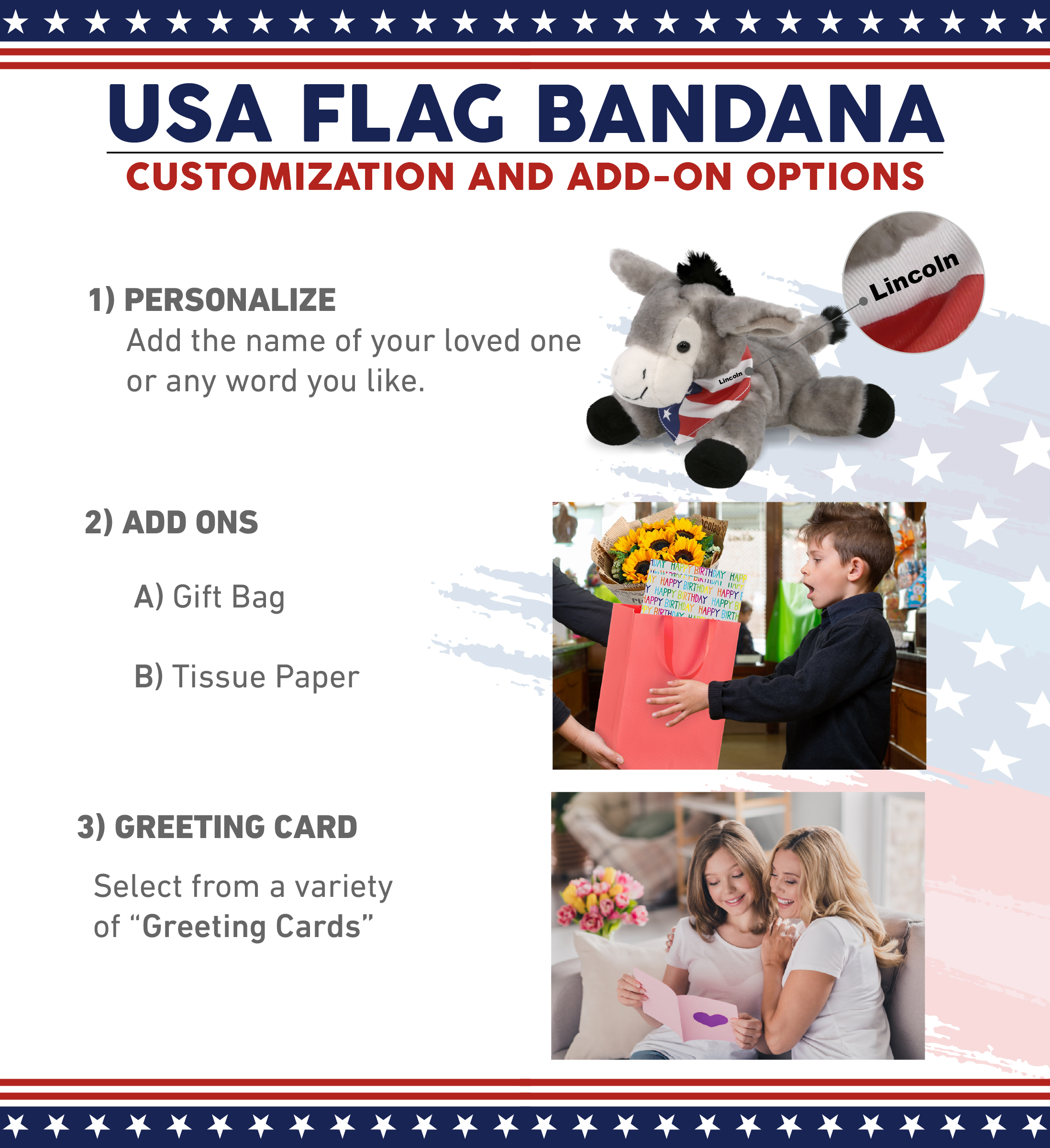 • Personalization, Customization, and Add-On Options – The stuffed donkey plush toy comes dressed with a removable USA Flag Bandana to give a unique patriotic twist. Make the plush donkey toy cool and unique by personalizing it with the name, which we will imprint directly onto the plush. You can also customize your plush donkey by adding any of our add-ons to create the perfect gift: 1) Gift Bag 2) Tissue Paper 3) Greeting Card.