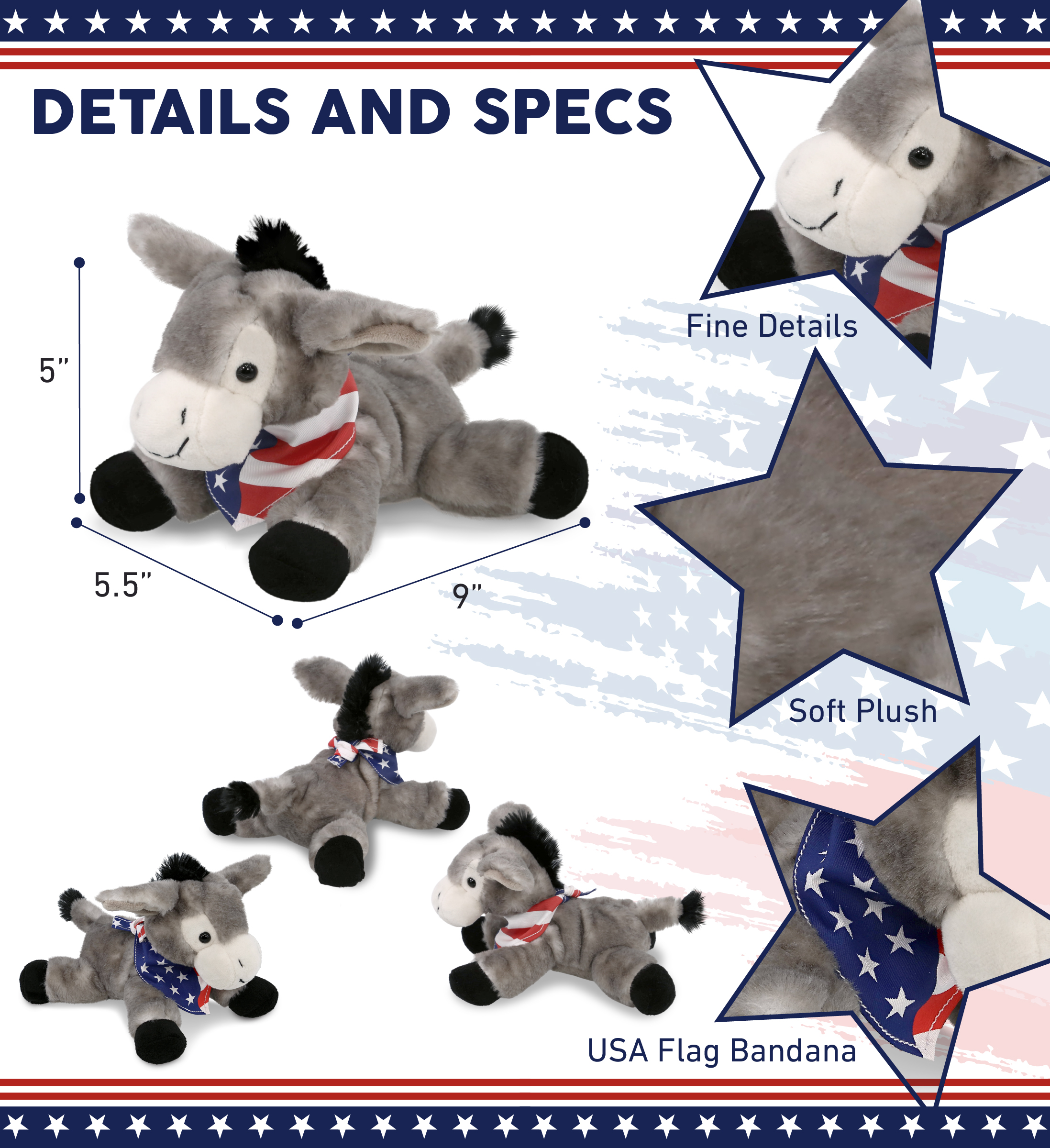 • Includes 1 DolliBu Lying Grey Donkey Toy with USA Flag Bandana Dress Up Set – The stuffed animal donkey arrives with a removable red, white and blue USA flag bandana, making it a standout among stuffed animals with clothes. Turn your classic teddy bear donkey into collectible patriotic stuffed animal perfect for celebrating USA holidays. The donkey stuffed animal measures 9Lx5.5Wx5H inches and is for kids ages 0 and up.