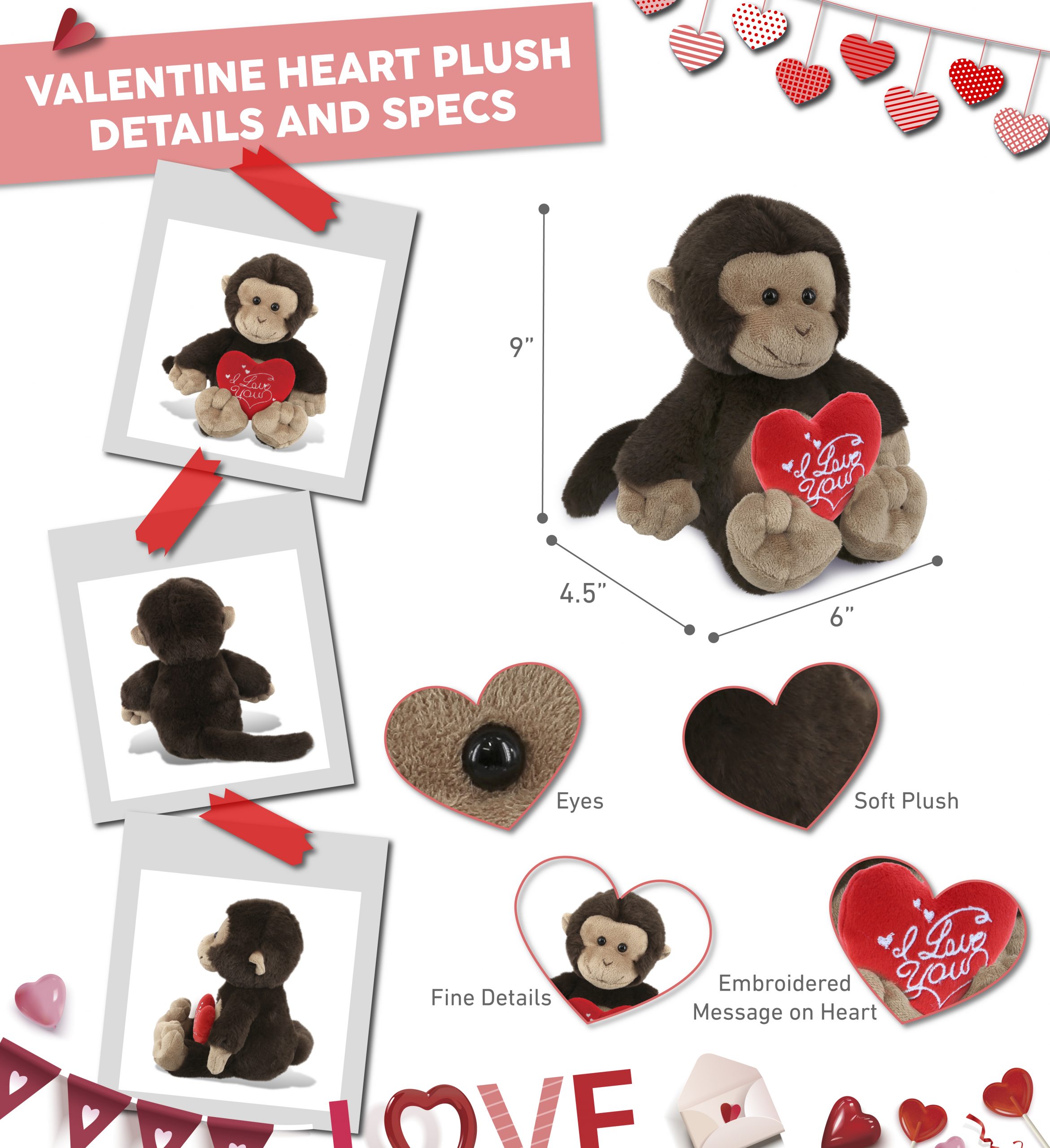 - INLUDED WITH THE PURCHASE OF VALENTINE PLUSH – Includes 1 DolliBu Super Soft Monkey Valentines Day Stuffed Animal Plush with a romantic message embroidered on the red stuffed heart plush. Make this Valentine’s Day plush a sweet stuffed animal Valentine gift for boyfriend or girlfriend. husband, wife, or a cute monkey plush surprise for your kids who love playing with stuffed monkey. The stuffed monkey plush measures 6LX4.5WX9H inches.
