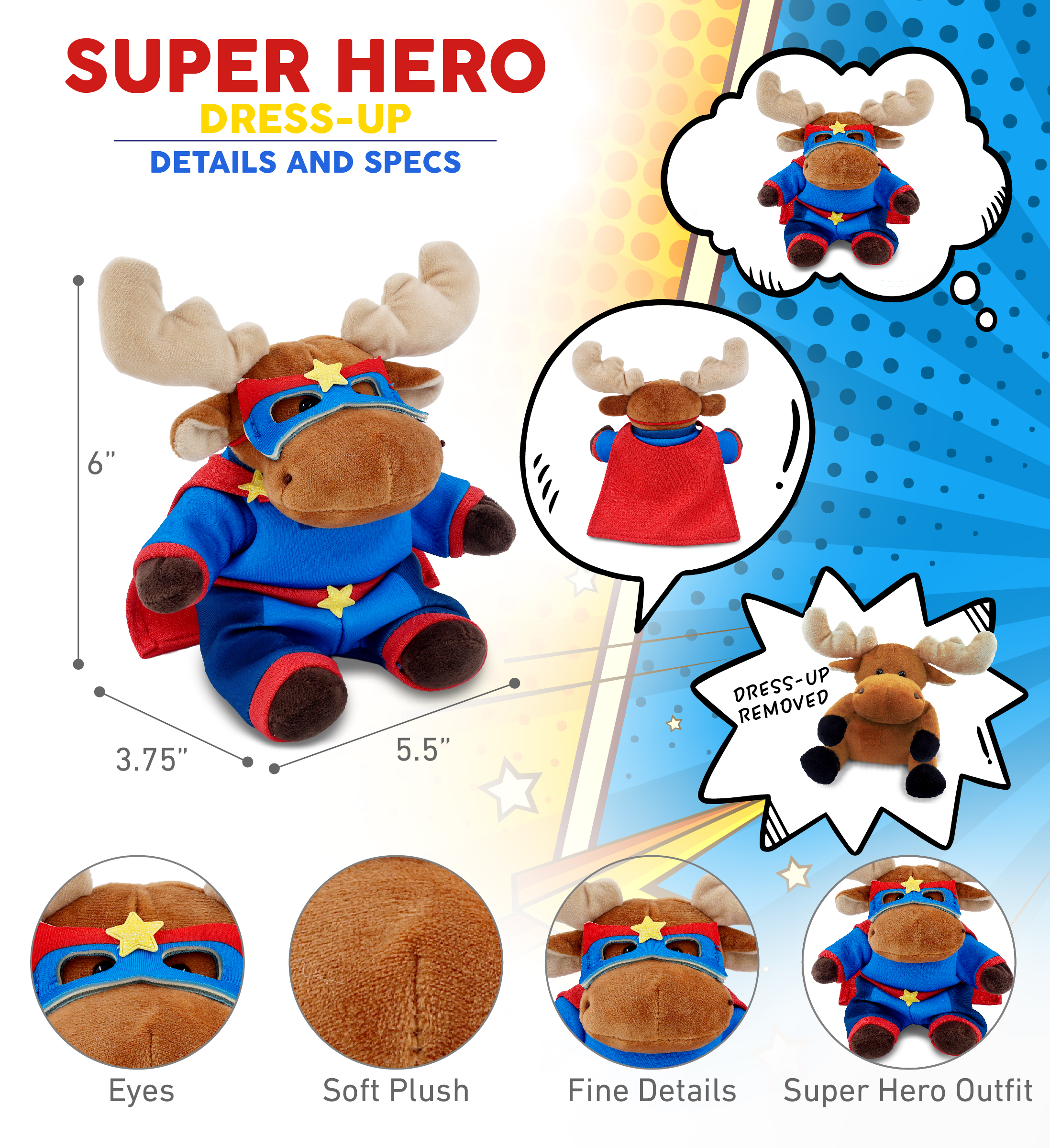 - Includes 1 DolliBu Moose Toy with Superhero Clothes for Stuffed Animals – The plush moose figure arrives with superhero clothes. The superhero stuffed moose toy features a blue superhero costume with red brims, yellow star accents, and a matching red cape. It’s the perfect toy for fans of superhero plush, animal plush, or moose collectibles. This moose stuffed animal measures 5.5Lx3.75Wx6H and is best recommended for ages 3 and up.