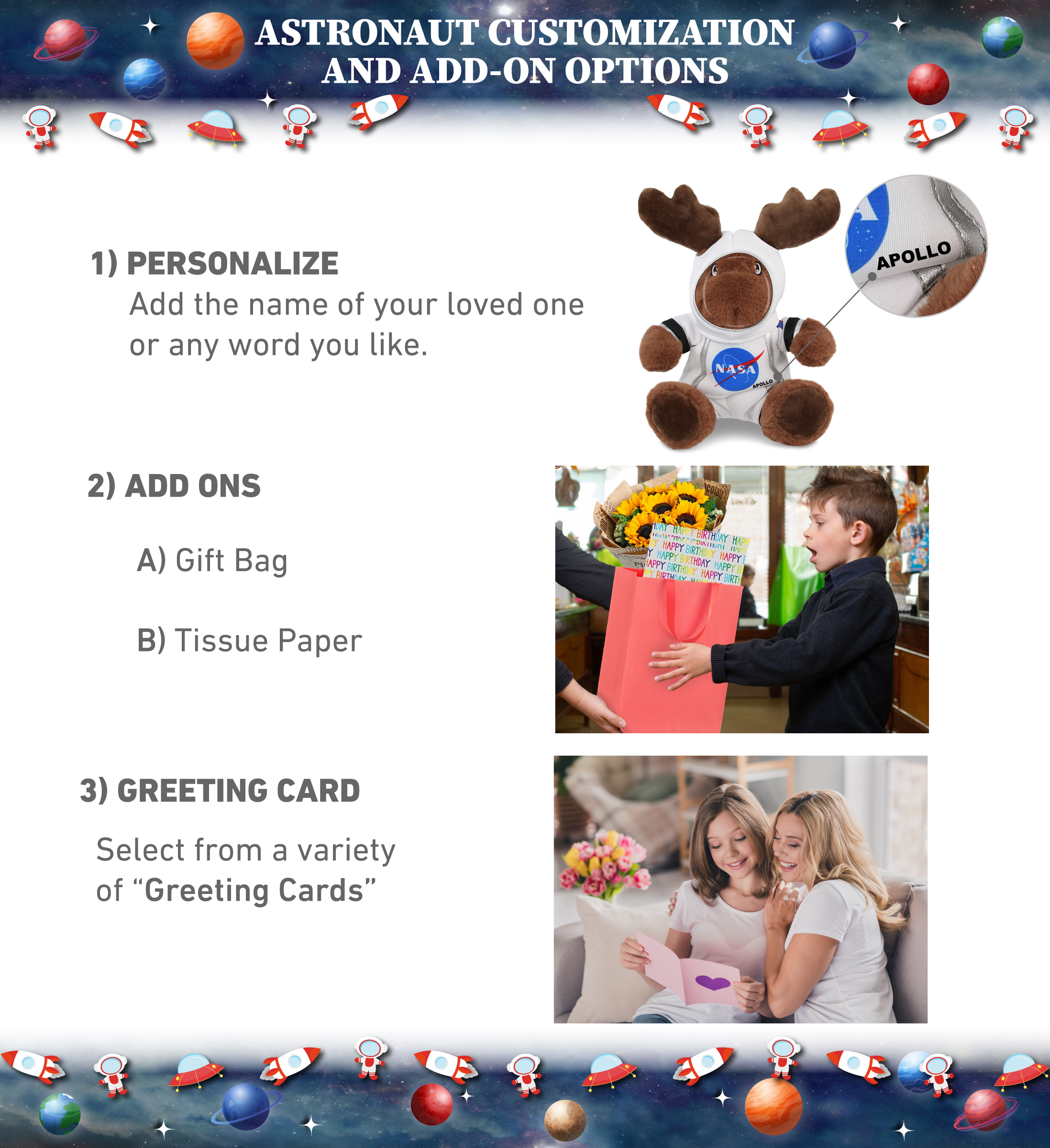 - Personalization, Customization, And Add-On Options – The Eco-Friendly Moose features an Astronaut outfit, with a space helmet and a NASA astronaut outfit with a printed USA flag. Personalize it by adding the name of your loved one, which we will imprint on the item. You also have the option to customize your astronaut plush by adding some or all of our cool add-ons to make it extra special: 1) Gift Bag 2) Tissue Paper 3) Greeting Card.
