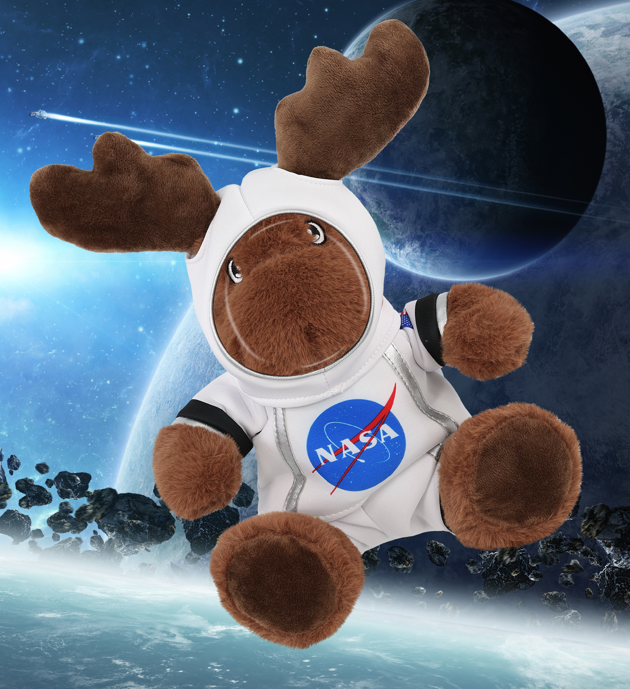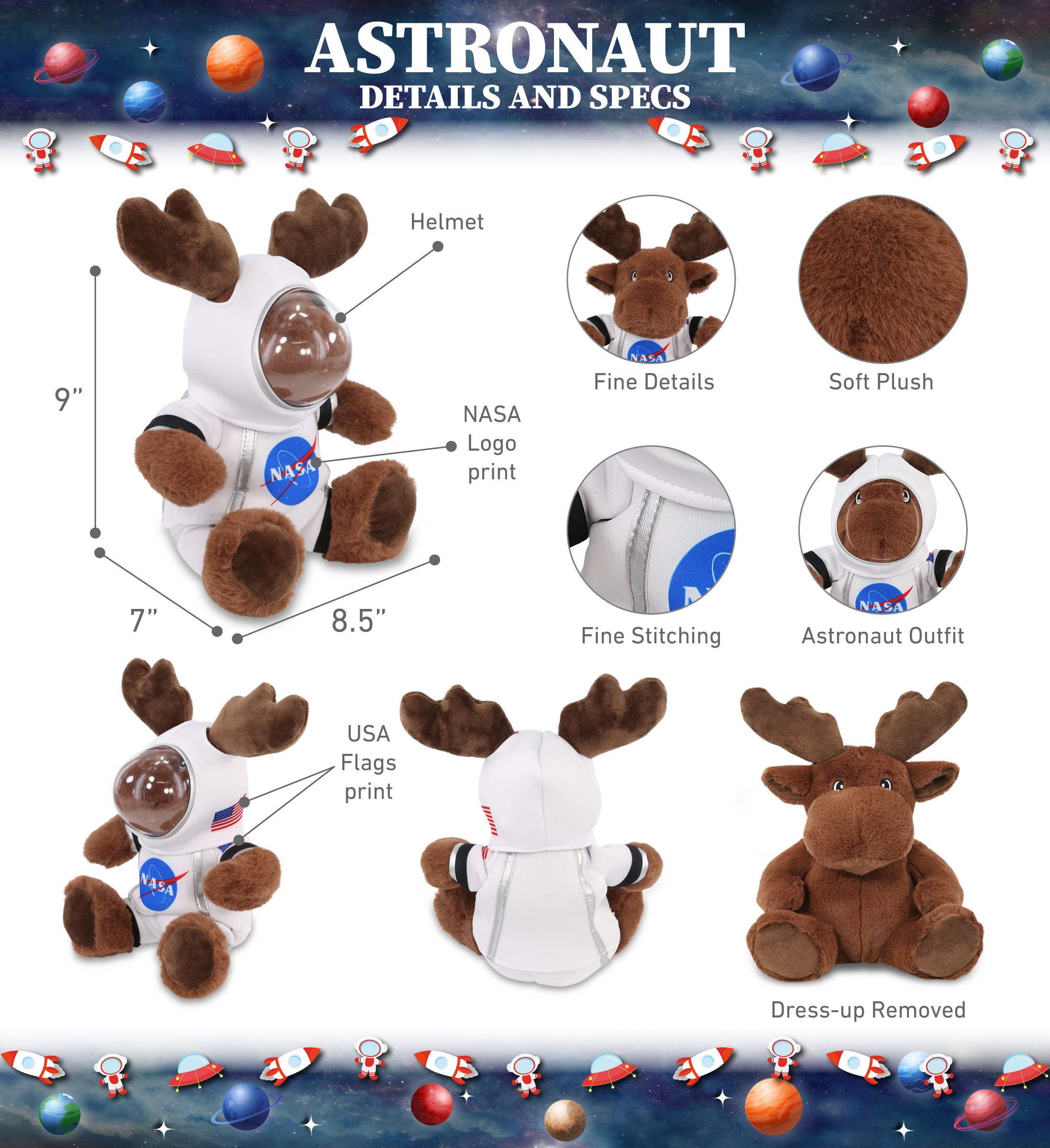 - Included with The Purchase of Moose Plush Astronaut – Includes 1 DolliBu Super Soft Eco-Friendly Moose with plush Astronaut Outfit. The moose with NASA doll clothes features a realistic spaceman doll with astronaut costume accessories, complete with a spaceman helmet costume and space suit clothes for stuffed animals, making it the perfect space stuffed animal. The Astronaut stuffed animal clothing measures 8.5Lx7Wx9H inches.