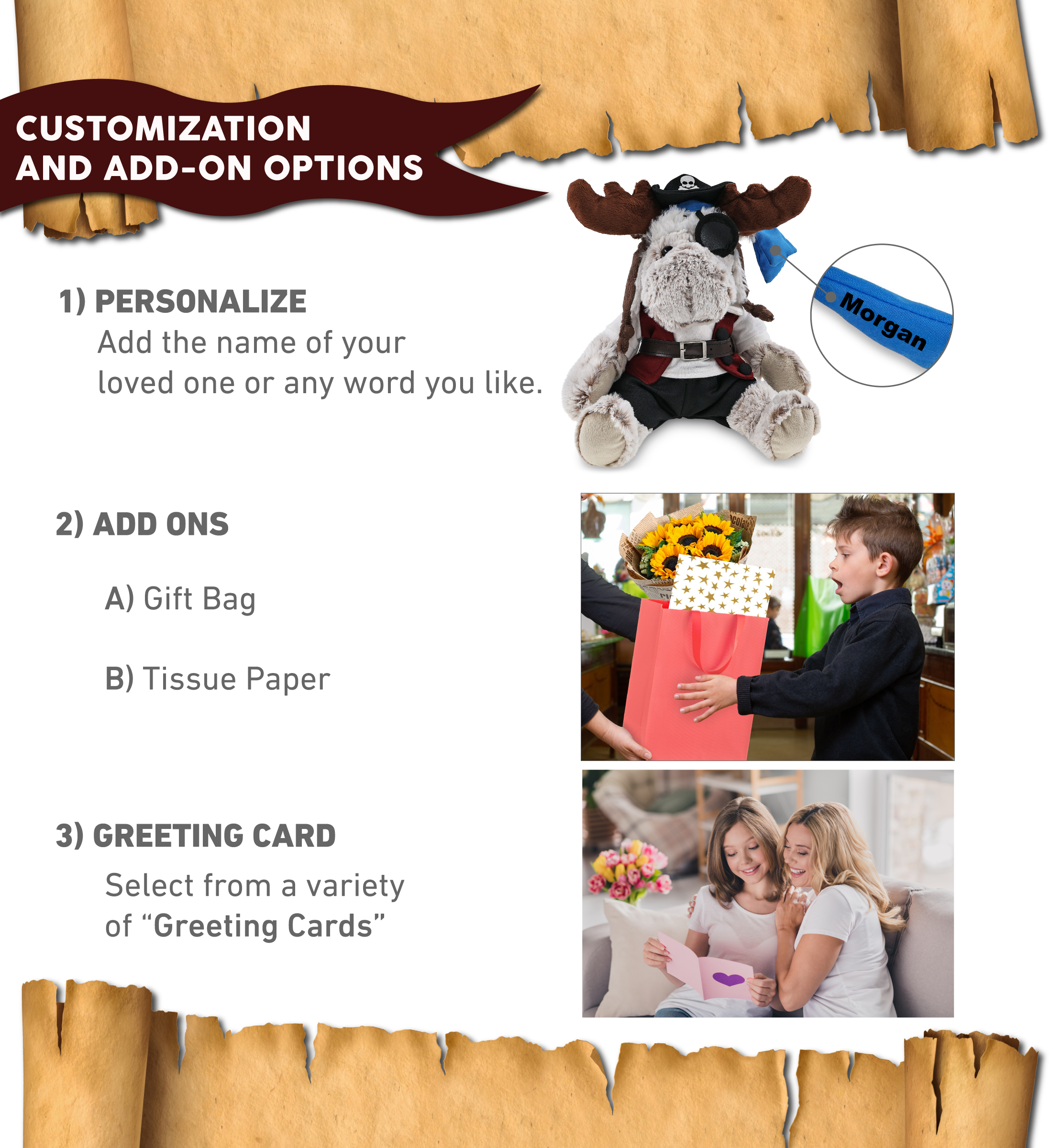 - Personalization, Customization, and Add-On Options – The moose figure stuffed toy comes dressed in full pirate clothes, complete with pirate hat, pirate vest, pirate shirt, pants, belt, and pirate mask. Make your bear doll special by adding a personalized name, which we will imprint onto the plush. You can also customize your stuffed animal by adding any of our add-ons to create the perfect gift: 1) Gift Bag 2) Tissue Paper 3) Greeting Card.