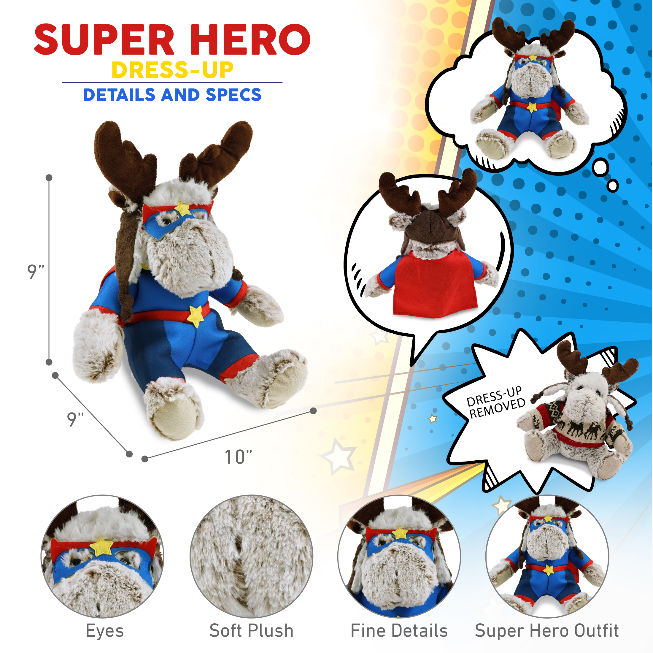 - Includes 1 DolliBu Moose With Clothes Toy with Superhero Stuffed Animal Clothes – This moose plush animal arrives in a superhero costume. Dressed in a blue suit with cape and eye mask, this stuffed animal stands out in any plush toy collection. It’s a great gift for Halloween, birthdays, or superhero events. Super hero outfit can be easily dressed or undressed for dress up play. This moose plush measures 10Lx9Wx9H inches.