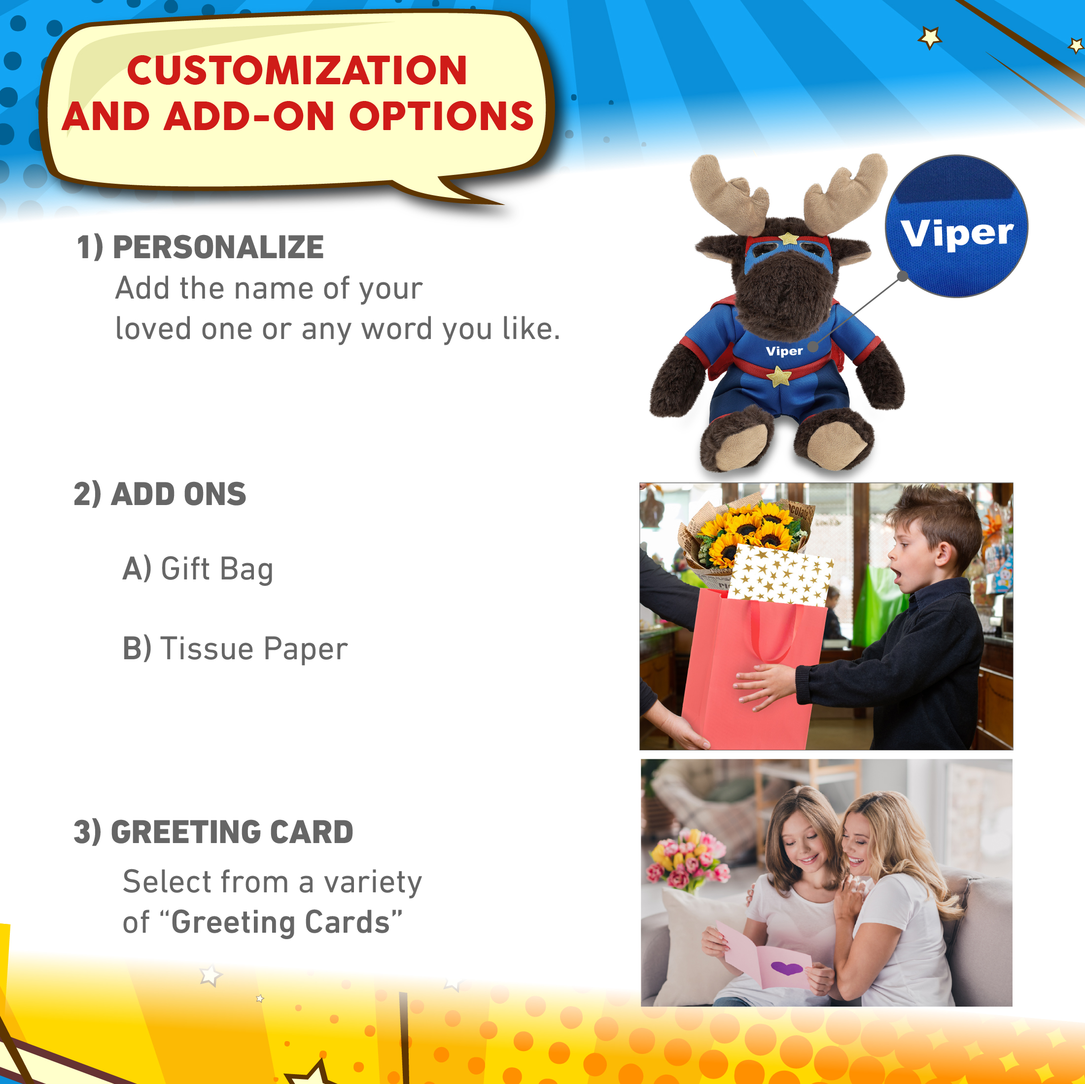 - Personalization, Customization, and Add-On Options – The red plaid hoodie moose stuffed animal comes dressed in a full superhero outfit, complete with eye mask, suit with cape, and star details. Make your super hero moose toy special by adding a personalized name, which we will imprint onto the plush. You can also customize your plush hero toy by adding any of our add-ons to create the perfect gift: 1) Gift Bag 2) Tissue Paper 3) Greeting Card.