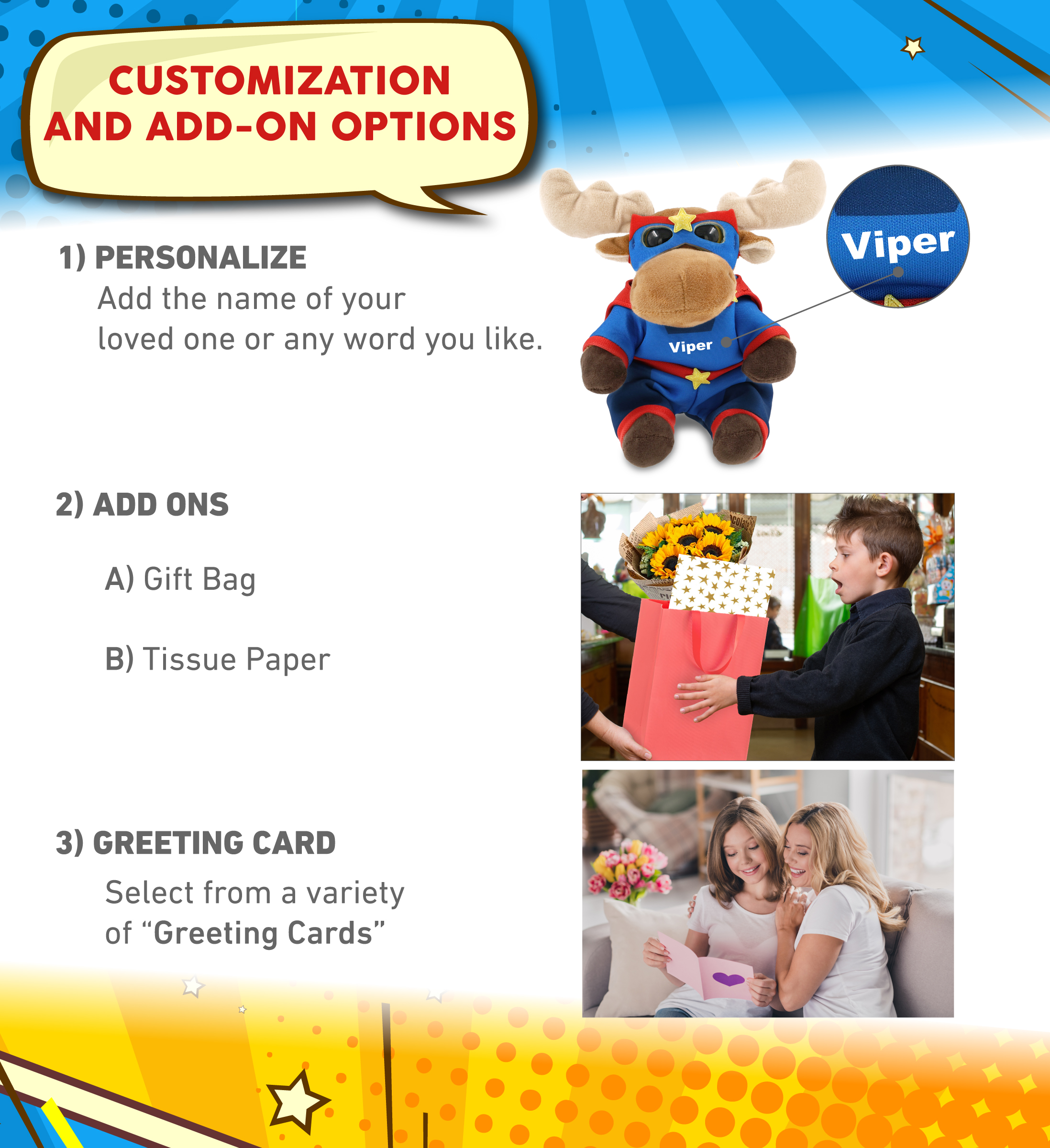 - Personalization, Customization, and Add-On Options – The Big Eye Moose stuffed animal comes dressed in a full superhero outfit, complete with eye mask, suit with cape, and star details. Make your super hero moose toy special by adding a personalized name, which we will imprint onto the plush. You can also customize your plush hero toy by adding any of our add-ons to create the perfect gift: 1) Gift Bag 2) Tissue Paper 3) Greeting Card.