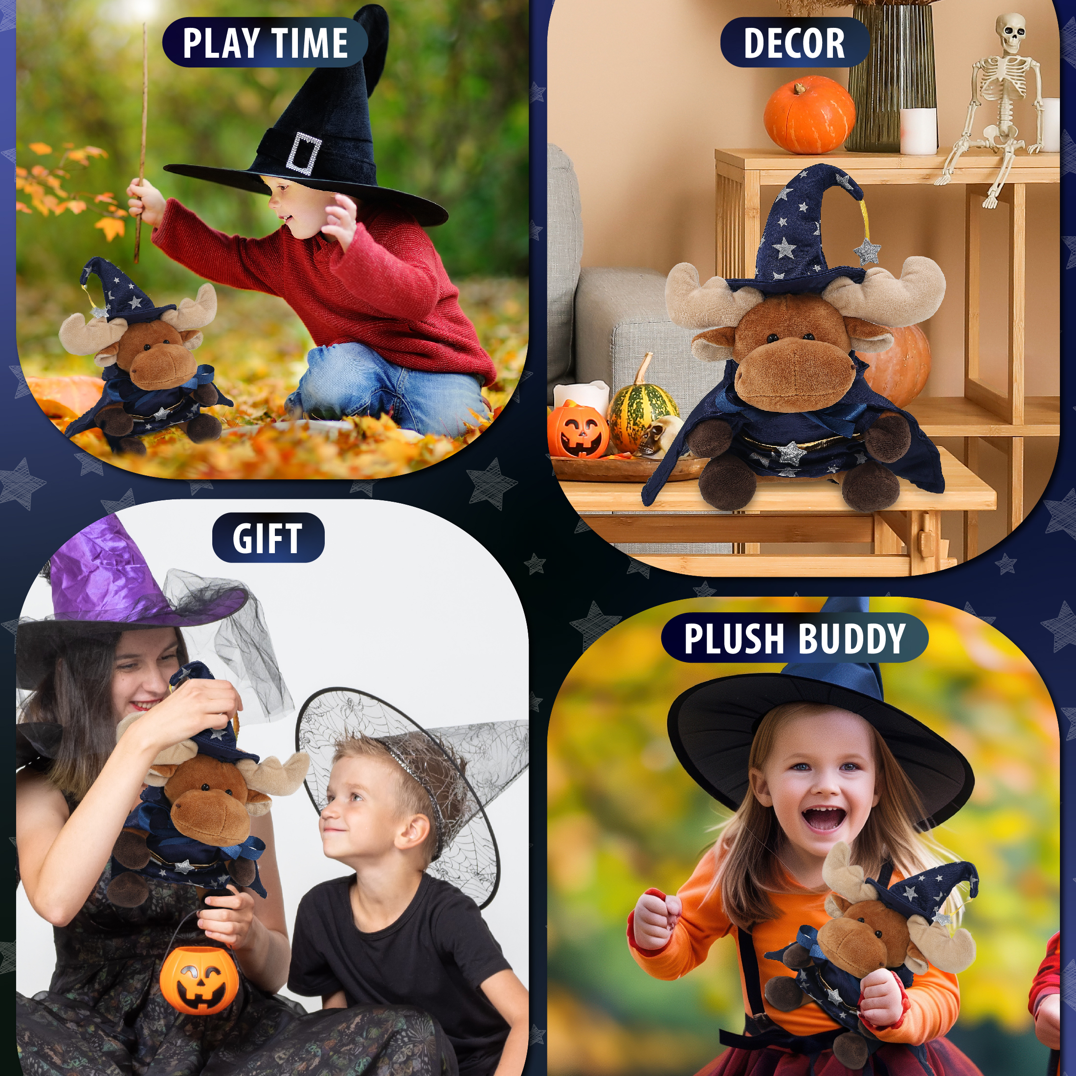 - Features a Cute Moose Plush with Wizard Stuffed Animal Clothes – With a wizard cloak and wizard stuffed animal hat adorned with silver stars, this moose Halloween stuffed animal has a playful and stylish magical look! The detailed wizard fantasy outfit adds character to your stuffed toys and makes them stand out among other cute moose figures. Everyone will love to play with a huggable stuffed animal with wizard clothes for stuffed animals.