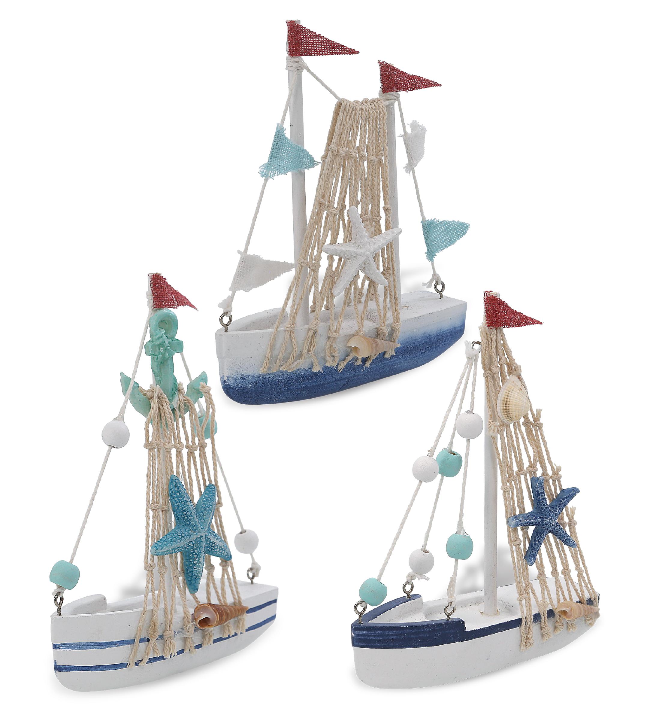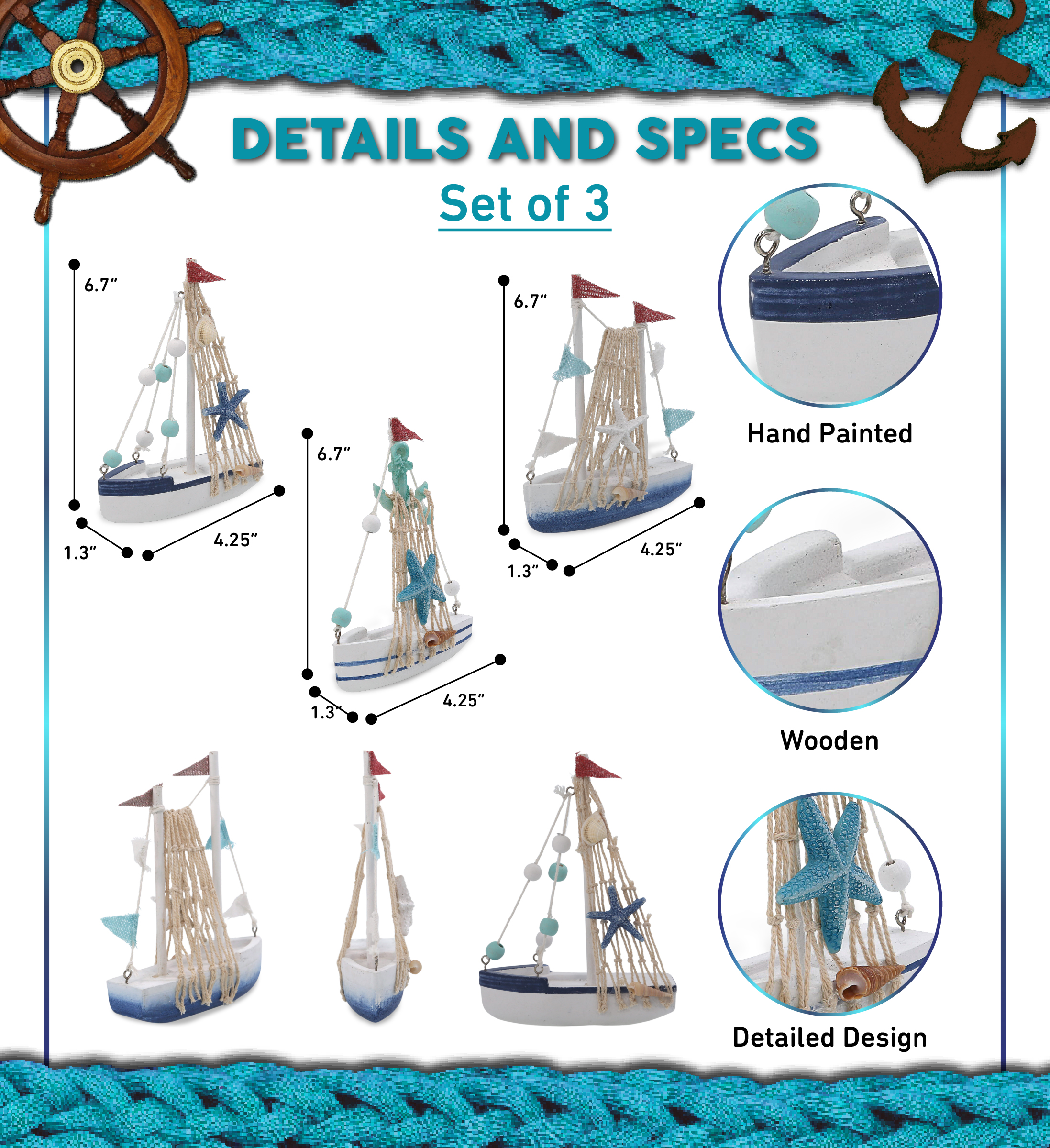 - Included with the Purchase of Mini Sailboat Nautical Decor for Home – Includes 1 Ocean Blue Mini Wooden Sailboats Set of 3. The cute mini sailboat models feature mini beach ornaments seashells , starfish figures, and nautical rope accents, making it a perfect centerpiece set for your coastal shelf decor, boat decor for home, or nautical party decor. The Ocean Blue mini handmade nautical themed decor sailboats measure 4.25Lx1.3Wx6.7H inches.