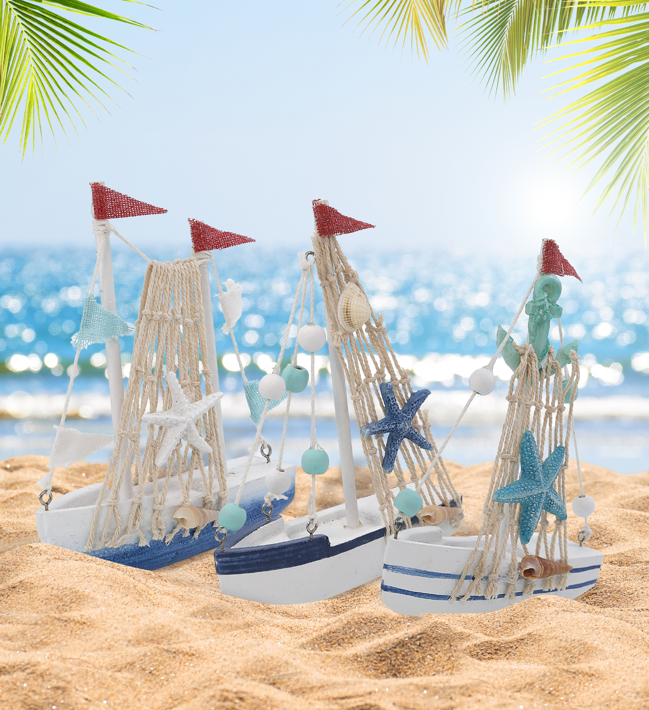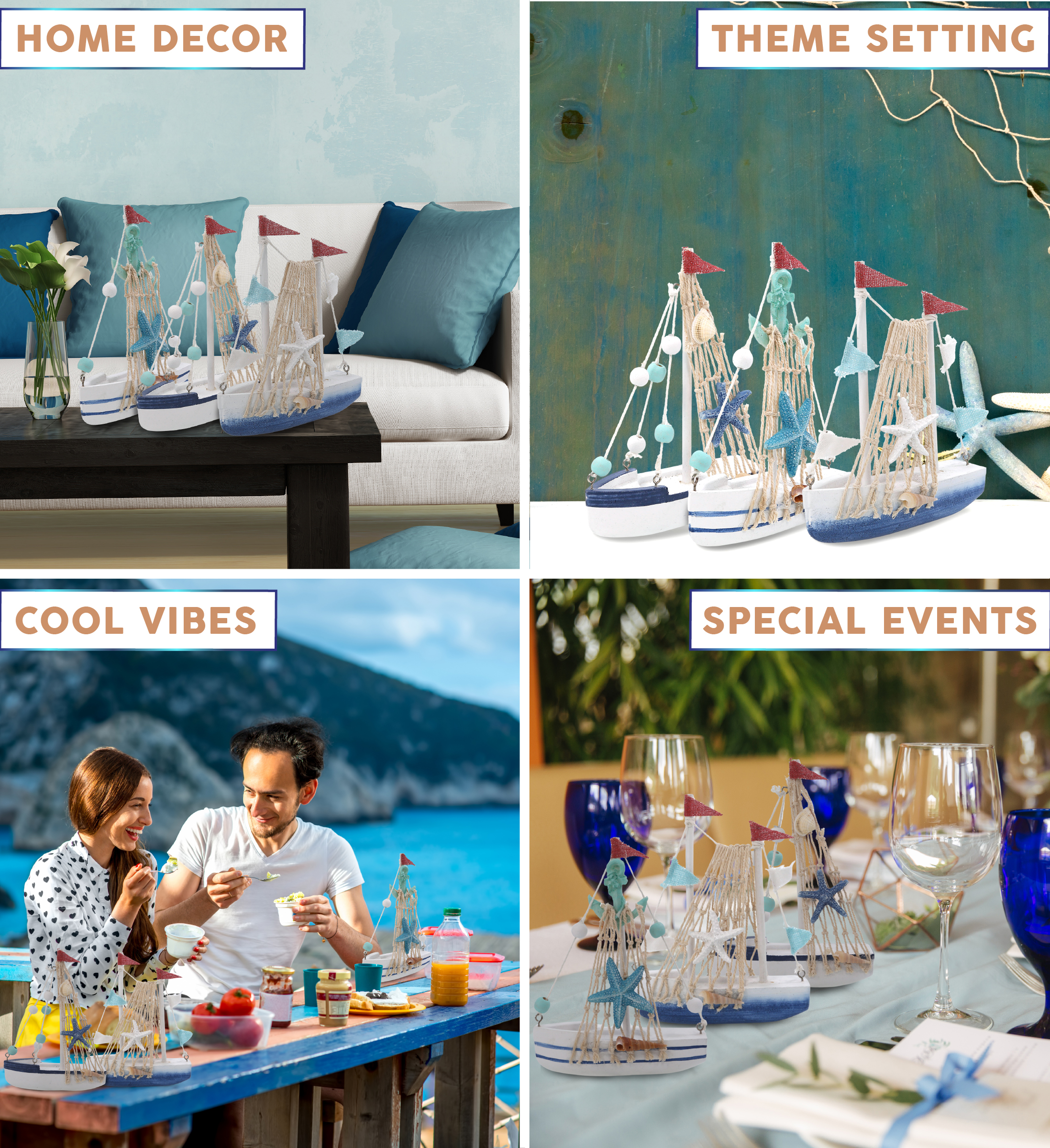 - The Mini Wooden Sailboats Come with Unique Design You Will Love – Bring the experience of cruising the wide-open sea with this Ocean Blue Mini Nautical Decor Boats Set. The small boats coastal home decor are adorned with seashell, starfish and rope details, decorated with colorful flags. The mini sailboats make a charming coastal decor piece to add a coastal touch to any space, or perfect sailboat decor for your nautical themed party decorations.