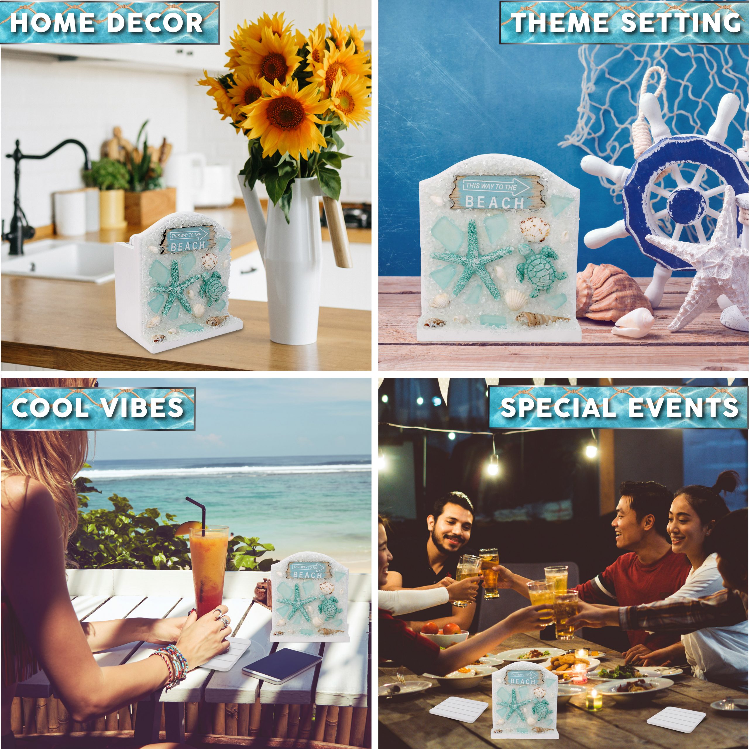 - Features Handcrafted Ocean Theme Kitchen Decor Wooden Coasters – These beach themed decor table top coasters are beautifully handcrafted with an ocean-inspired design that adds a coastal charm to your coastal kitchen decor or nautical theme decor for your bar. The wooden bar coaster holder is decorated with seashells, turtle, and starfish figures, accented with decorative white crystal sand, evoking a relaxing ocean feel for your beach house.