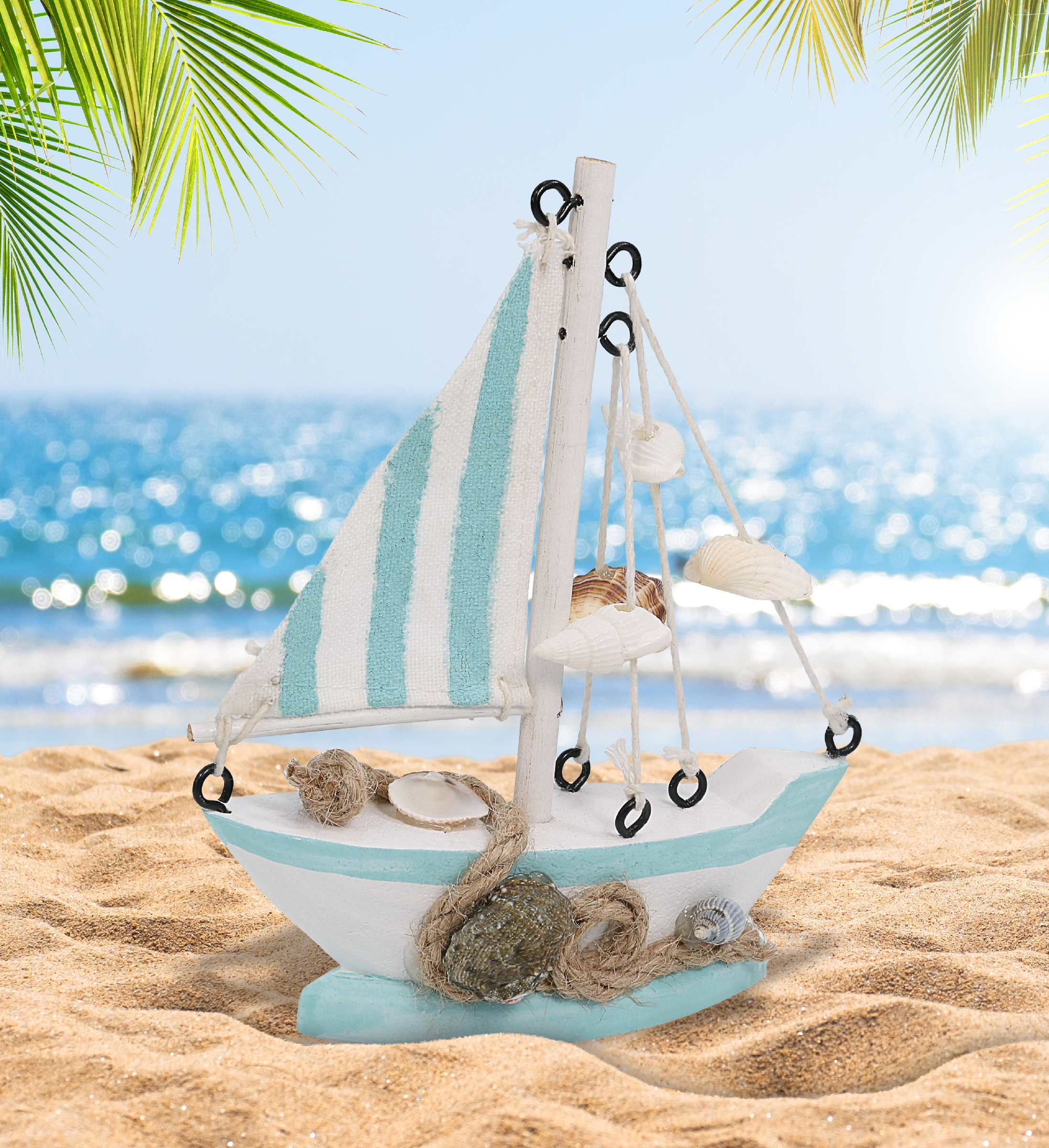 - The Mini Oceanic Wooden Sailboat Model Comes with Unique Design You Will Love – Bring the experience of cruising the wide-open sea with this Mini Nautical Decor Boat. The small boat coastal home decor is adorned with seashell ornaments, coiled rope, and white sail with blue stripes. This mini sailboat makes a charming coastal decor piece to add a coastal touch to any space, or a perfect sailboat decor for your nautical themed party decorations.