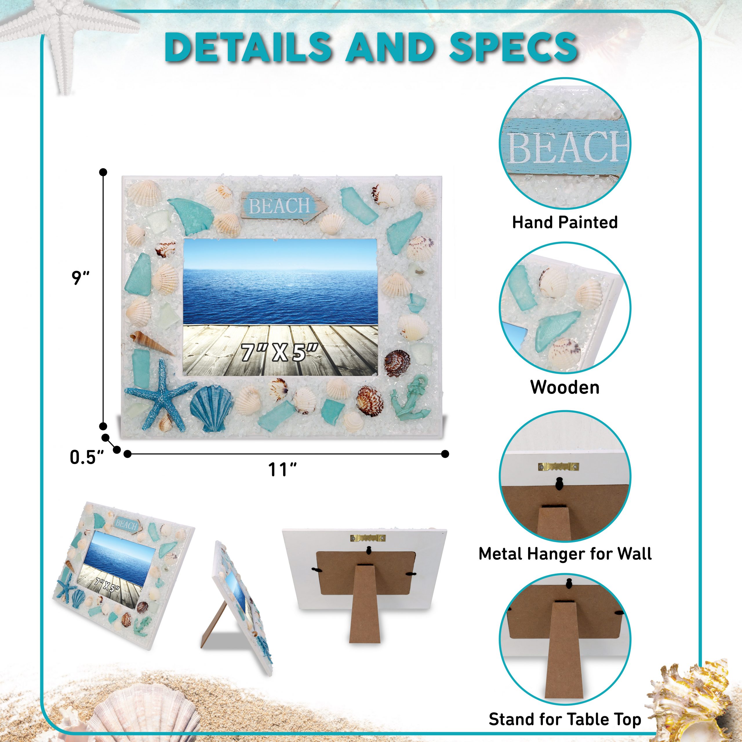 - The Nautical Picture Frame Adorned with Beach Theme Ornaments Is Perfect for Fun Shell Frame Lovers – Place your beachy pictures in this Oceanic wooden shell picture frame. Charming 7×5 beach picture frame to display your ocean pictures with loved ones and give your home an ocean touch with its sea shell beach decor ornaments. Collectors of wooden picture frames or coastal frames will be thrilled to add this beach wood frame to their collections.