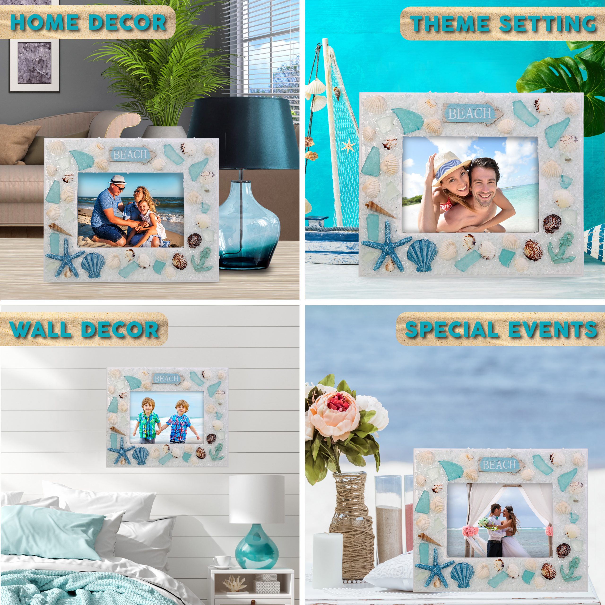 - The Ocean Frame for Pictures Comes with Unique Designs Every Coastal Picture Frame Enthusiast Will Love – Beautifully decorated with seashells, starfish and anchor ornaments around the photo frame’s edge. Perfect seashell picture frame to hold your memorable summer beach pictures with friends or family. Preserve your best memories through photos with the coastal picture frames to give your picture frames for table centerpieces an ocean vibe.
