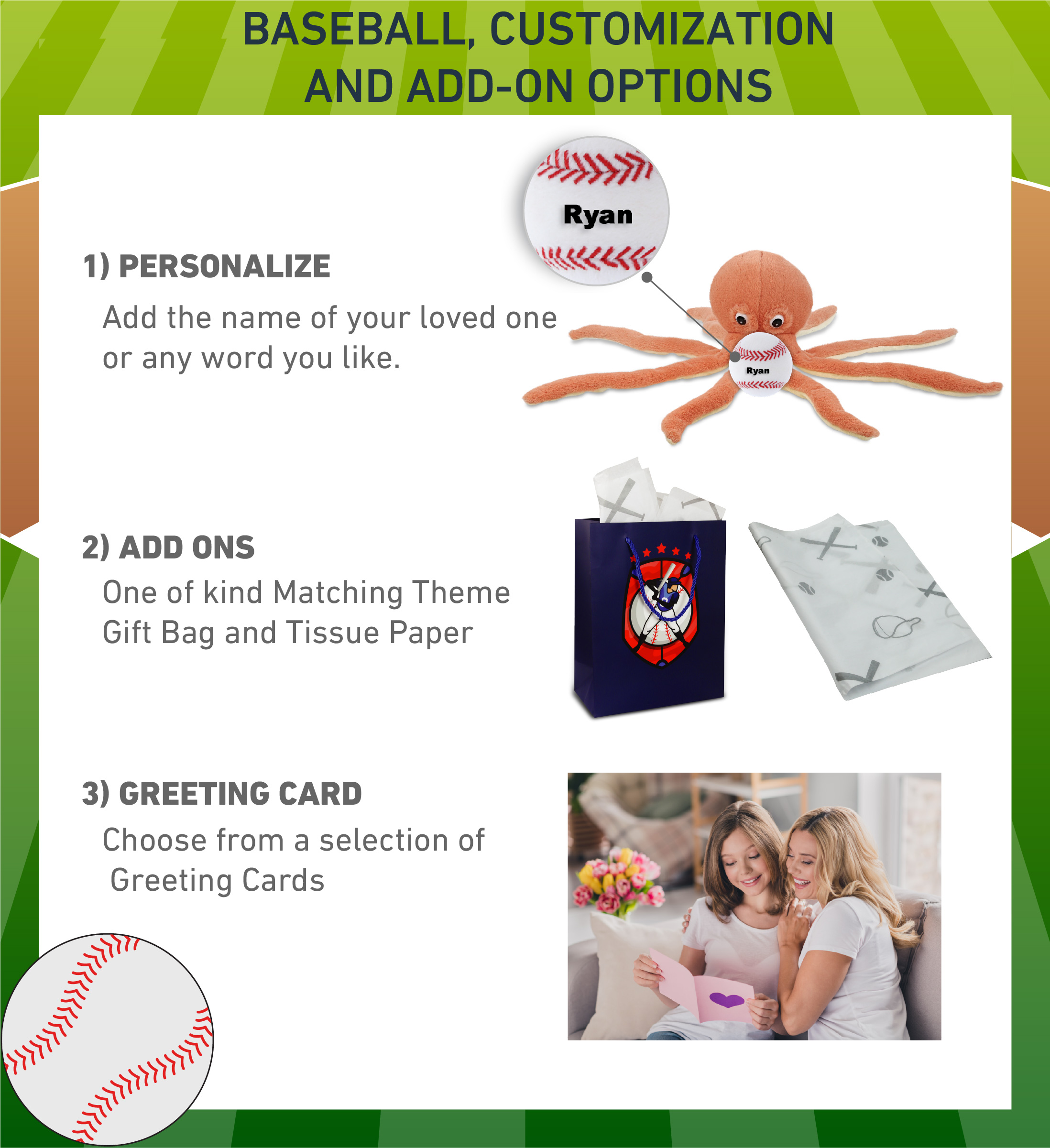 - Personalization, Customization, and Add-On Options – The Super Soft Sports Stuffed Animal Orange Octopus comes customized with a small baseball plush. You can personalize your stuffed animal octopus with the name of your loved one which we will imprint on the item. You also have the option to add some or all of the cool add-ons to make your gift extra special: 1) Gift Bag; 2) Tissue Paper; 3) Greeting Card.