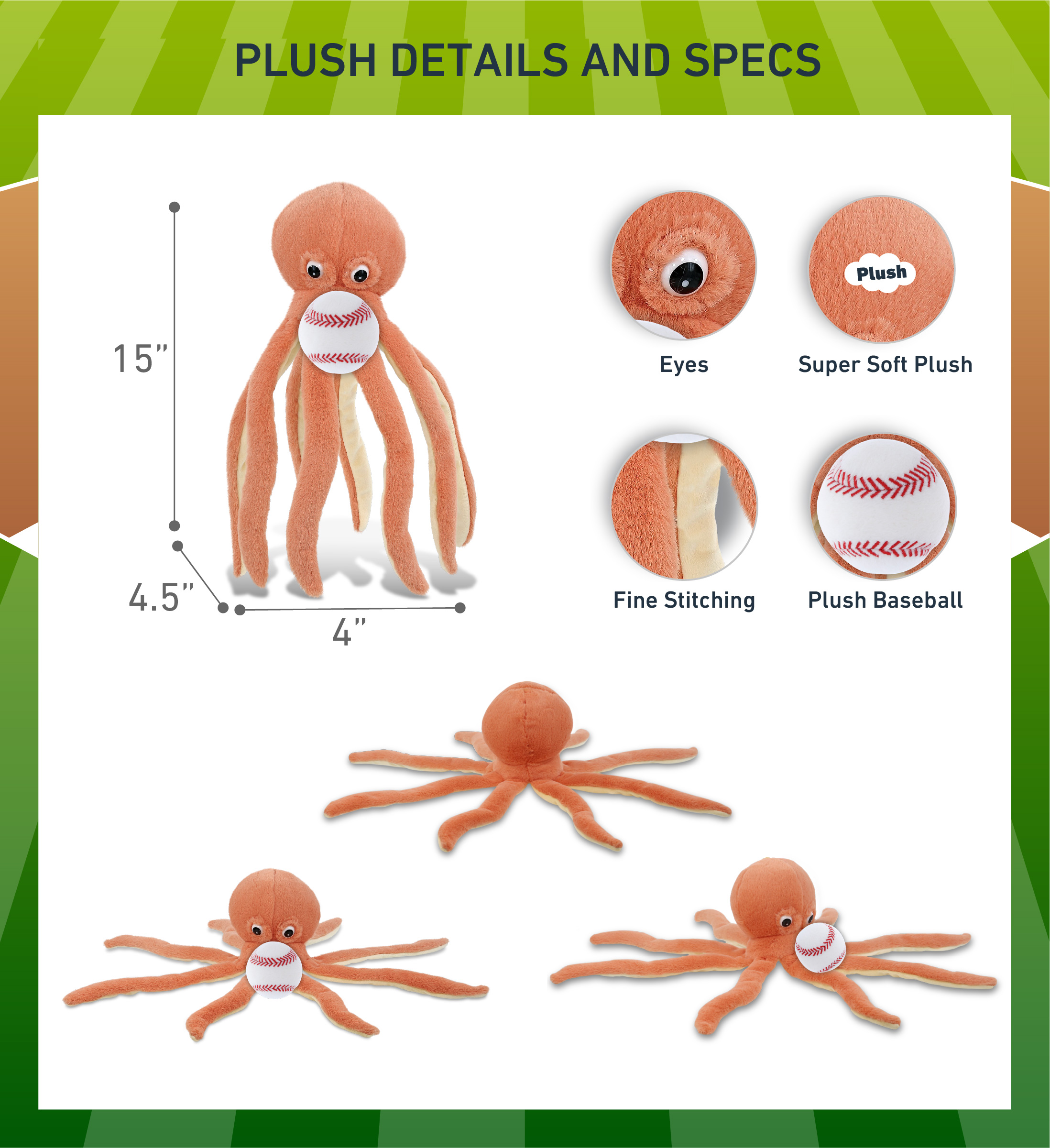 - Included with The Purchase of Orange Octopus Plush with Baseball Ball – Includes 1 DolliBu Orange Octopus Super Soft Stuffed Animal with a baseball plush, decorated with realistic features of a octopus. The baseball sports ball is attached to the octopus’s body, making it perfect for cuddles. The octopus plush toy features realistic details. The octopus’s eyes make the critter so charming. The cute plush toy buddy measures 4.5Lx4Wx15H inches.