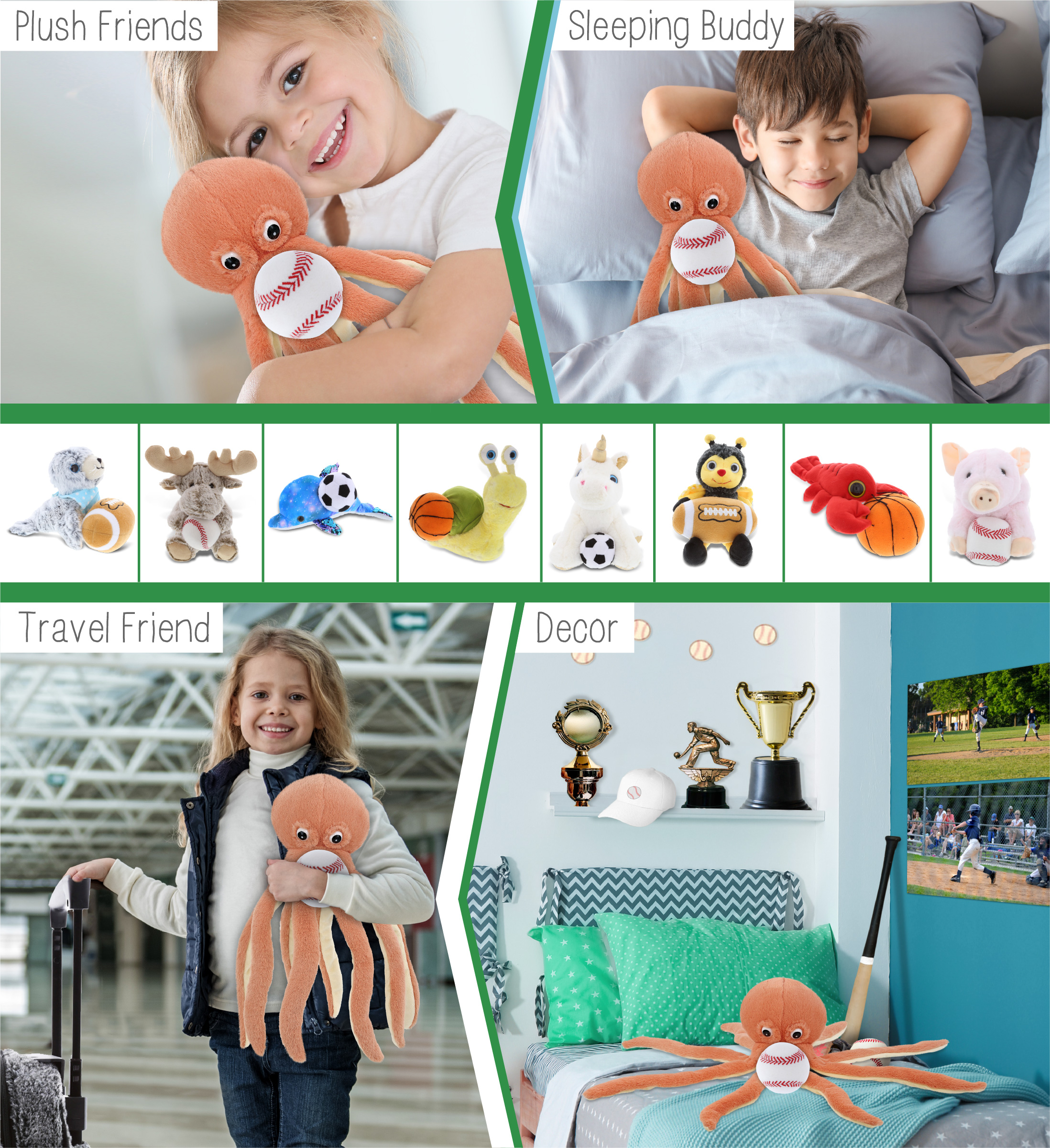 - Ideal Use for the Kids Baseball Plush and Stuffed Orange Octopus – The octopus baseball stuffed animal makes a great addition to your kids baseball stuff for boys collection. Great gifts for boys who love sports and plush dolls. If you’re looking for the perfect baseball gift ideas for kids, then this stuffed octopus with baseball plush is the perfect choice. It’s the perfect stuffed animal baseball birthday gifts to give on any special occasion.