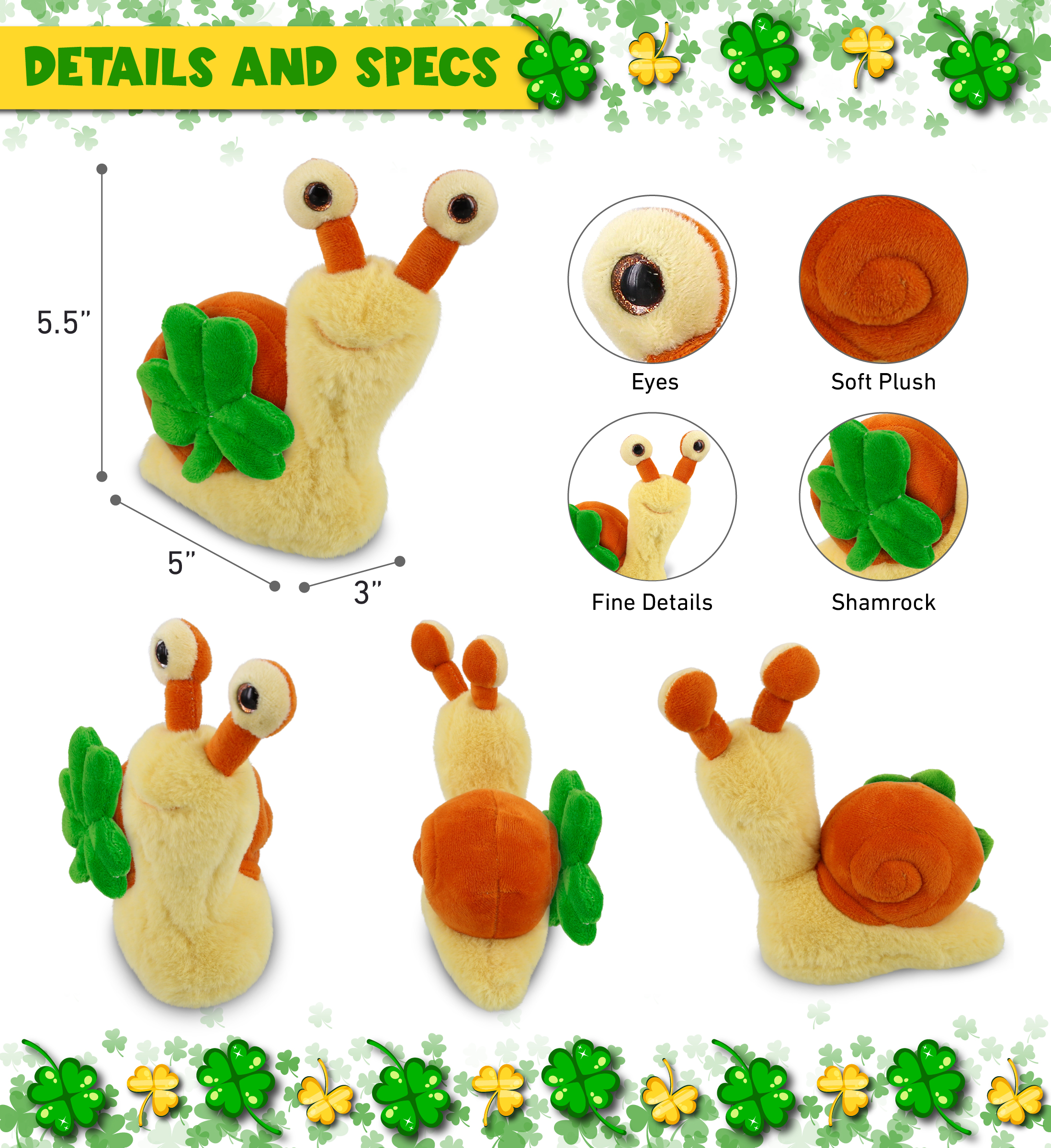 - THE SHAMROCK PLUSH ORANGE SNAIL IS FOR EVERYONE WHO LOVES STUFFED ANIMALS – The plush stuffed animal snail toy with an Irish shamrock is for everyone looking for meaningful stuffed animals to celebrate St Patricks Day. Perfect for Saint Patricks Day decor or cool prizes on St Patricks Day Games. Let the good and fun times roll with this snail with a green plush shamrock; cute green St Patricks Day Gift to give this festive season.