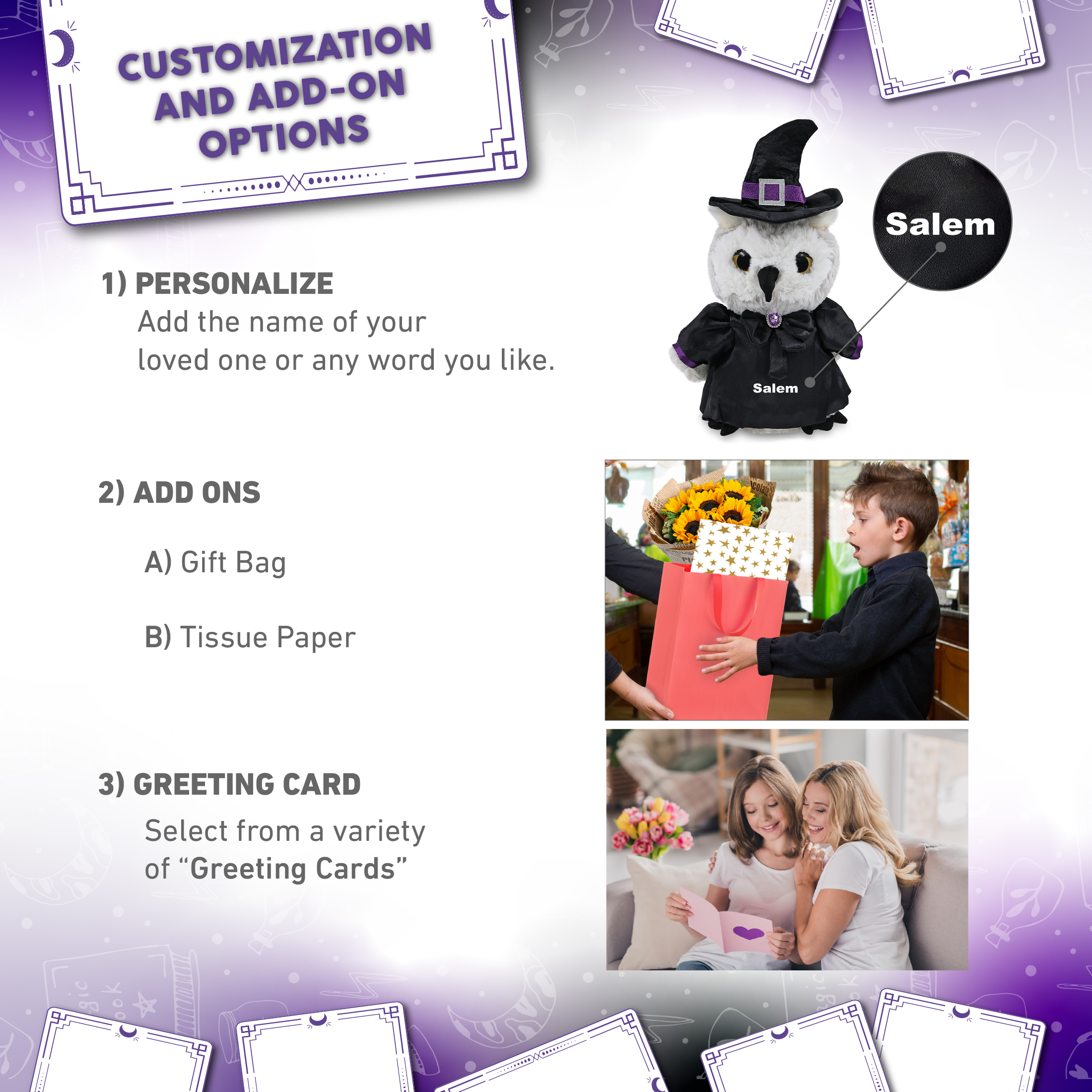 - Personalization, Customization, and Add-On Options – The owl Halloween plush toy comes dressed in a witch outfit, complete with black and purple cloak and pointy black witch hat. Make your teddy bear doll special by adding a personalized name, which we will imprint onto the plush. You can also customize your witch owl bird stuffed animal by adding any of our add-ons to create the perfect gift: 1) Gift Bag 2) Tissue Paper 3) Greeting Card.