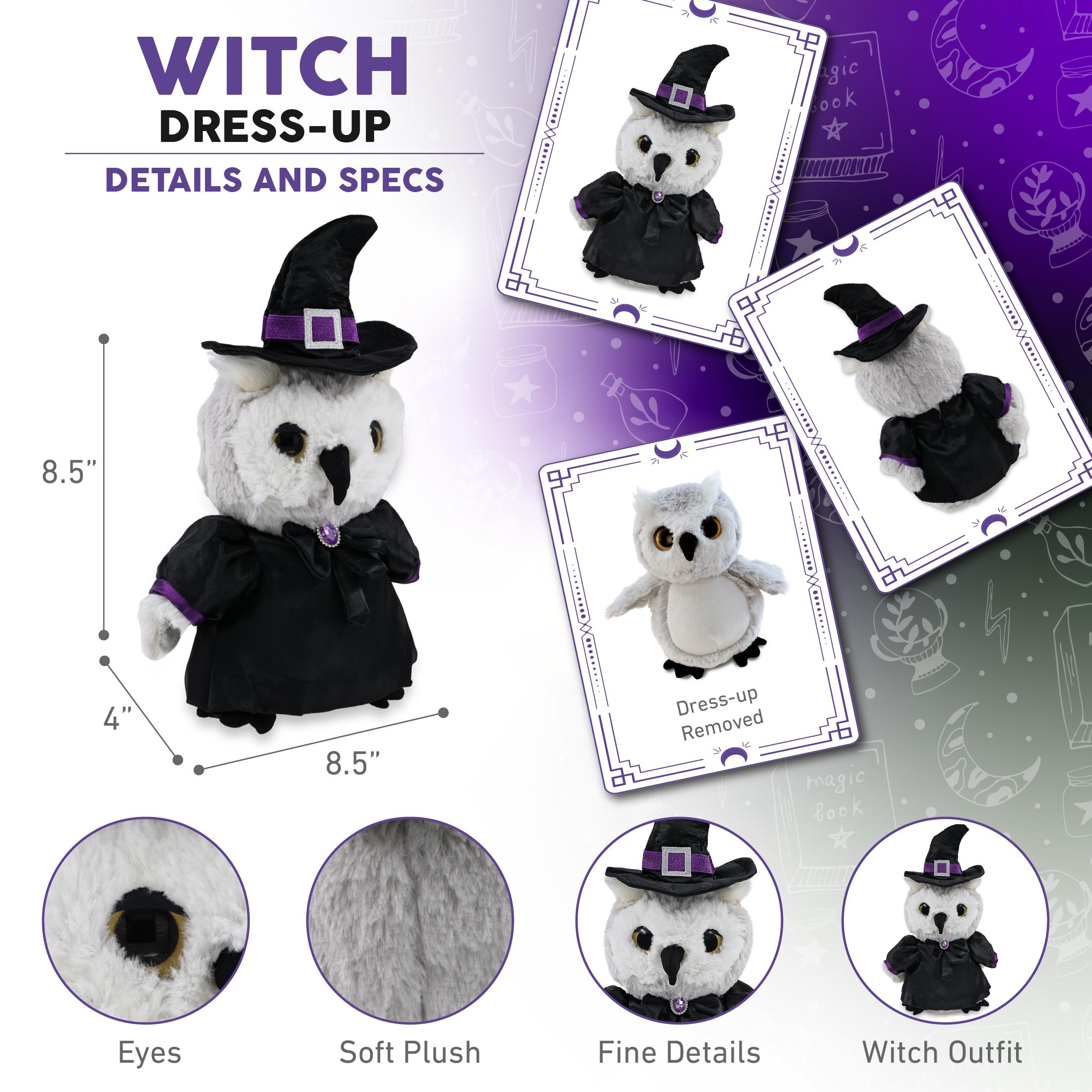 - Includes 1 DolliBu Owl Bird Plush Toy Dressed in Witch Costume – The plush owl arrives with a witch stuffed animal costume. The witch stuffed owl toy features a black witch dress up set with intricate purple details and black bow with gem. The perfect teddy bear plush to add spooky vibes to a display, along with your other Halloween stuffed animals. A cute owl bird stuffed animal that measures 8.5Lx4Wx8.5H inches, perfect for ages 3 and up.