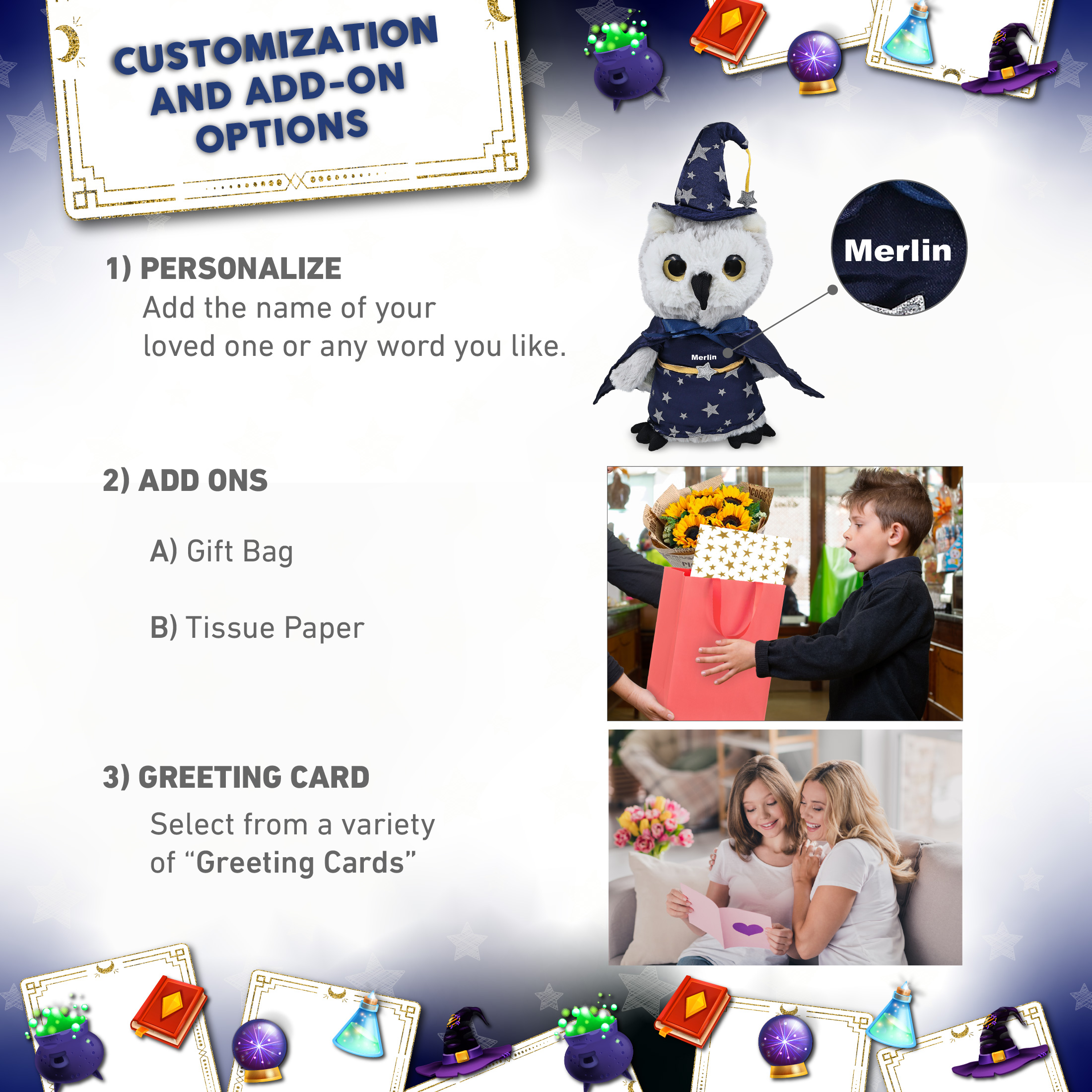 - Personalization, Customization, and Add-On Options – The owl bird stuffed animal comes dressed in a complete wizard outfit, with a wizard cloak and hat with silver star details. Make your wizard stuffed owl special by adding a personalized name, which we will imprint onto the plush. You can customize your plush wizard toy by adding any of our add-ons to create the perfect gift: 1) Gift Bag 2) Tissue Paper 3) Greeting Card.