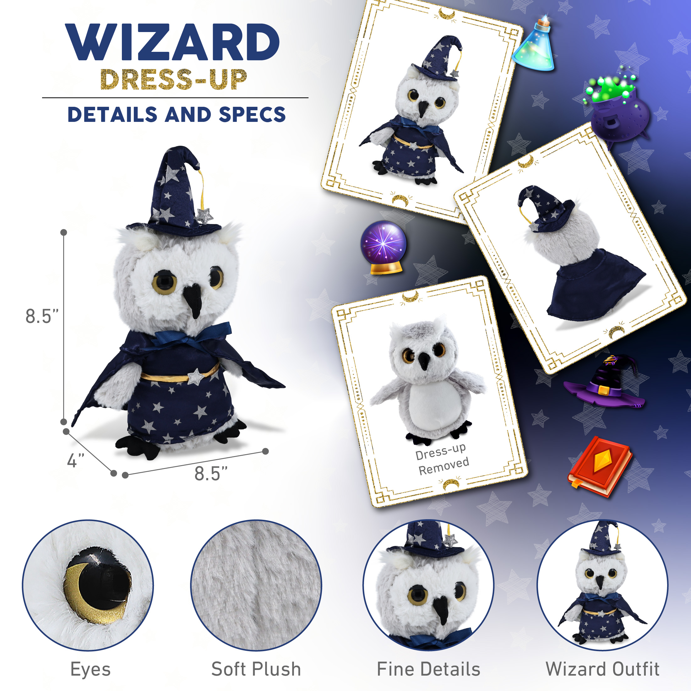 - Includes 1 DolliBu Owl Toy with Wizard Stuffed Doll Clothes – This plush wild animal arrives in magical wizard owl clothes. Dressed in a blue wizard robe and hat, this soft plush animal stands out in any wizard toy collection. It’s a great owl gift for Halloween or birthdays. The wizard doll clothes can be easily dressed or undressed for dress-up play. This cute owl plush wizard buddy measures 8.5Lx4Wx8.5H inches.