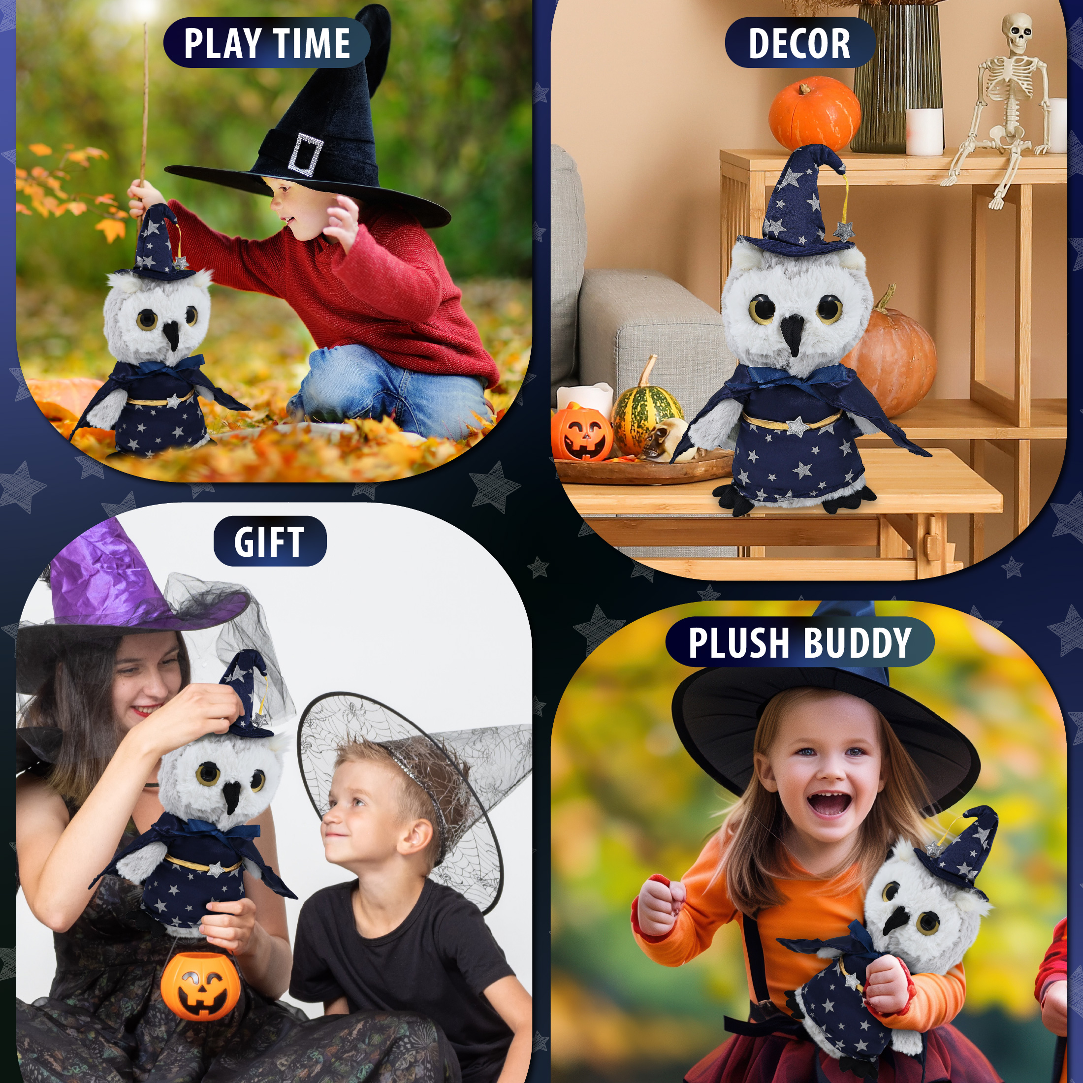 - Features a Cute Owl Plush with Wizard Stuffed Animal Clothes – With a wizard cloak and wizard stuffed animal hat adorned with silver stars, this owl Halloween stuffed animal has a playful and stylish magical look! The detailed wizard fantasy outfit adds character to your stuffed toys and makes them stand out among other cute owl figures. Everyone will love to play with a huggable stuffed animal with wizard clothes for stuffed animals.
