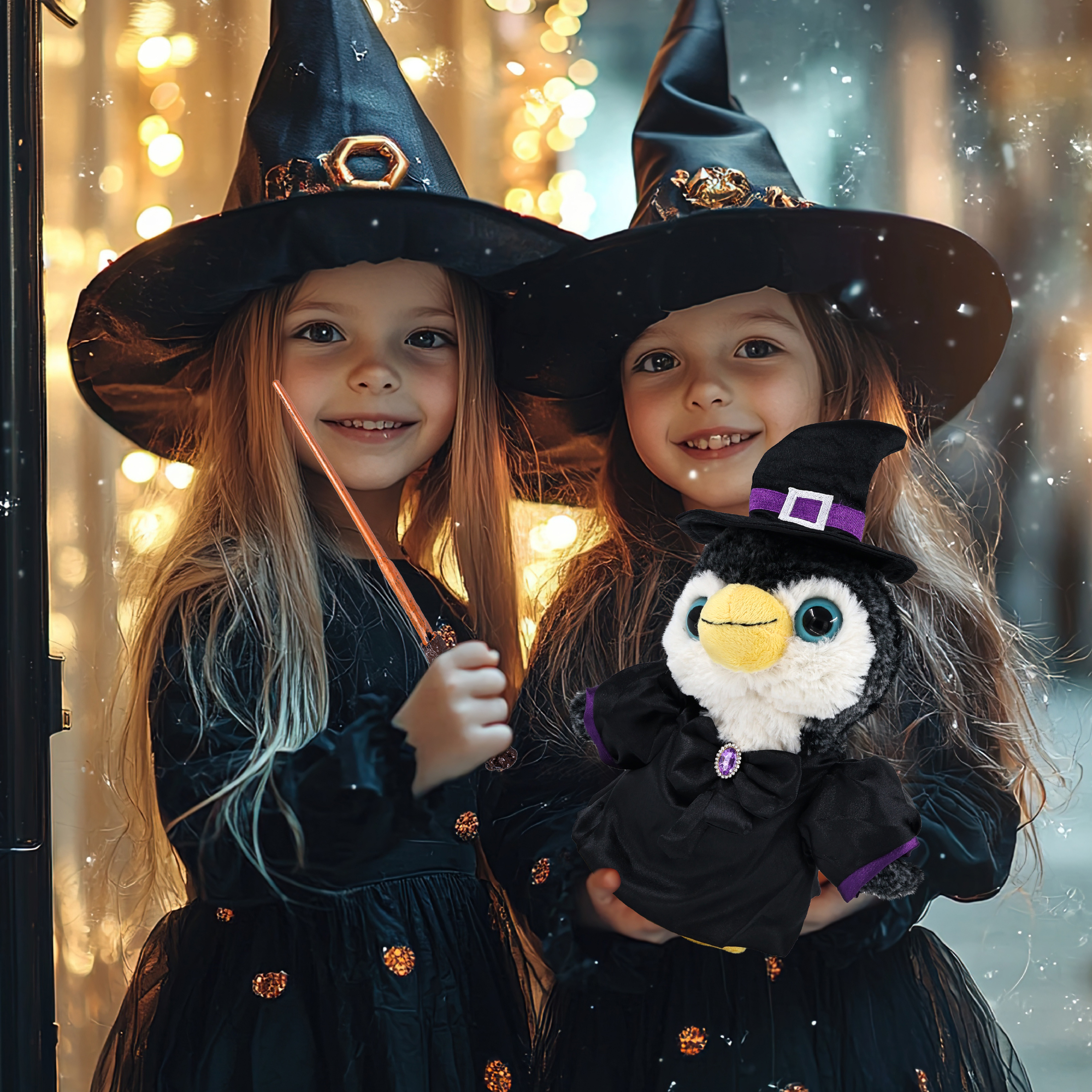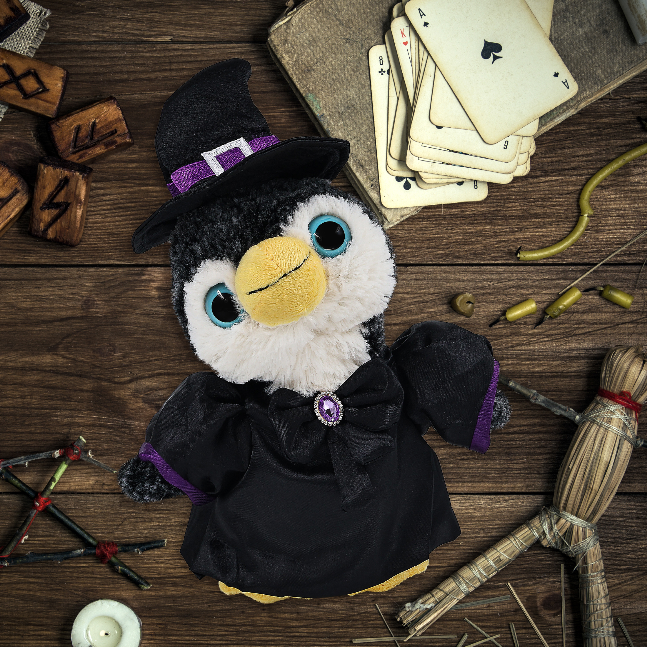 Everyone who loves witch stuff and stuffed witch dolls for kids will be thrilled to get this penguin stuffed animal with witch costume. Perfect addition to your Halloween stuffed toys and witch doll decor. Ideal Halloween themed gifts for fans of cute Halloween themed plush toys, penguin themed gifts, witch toys, and collectors of spooky toys for kids. This cute witch stuffed penguin plush comes dressed in a soft black satin witch doll dress with purple trim and a shiny gem-accented bow. It also wears a pointy black hat witch accessory, designed with a silver buckle and purple band, completing the spooky Halloween teddy bear look. The plush Halloween penguin witch costume is removable and fits snugly on the penguin witch spooky plush. The penguin Halloween plush toy comes dressed in a witch outfit, complete with a black cloak and a pointy black witch hat. Make your teddy bear doll special by adding a personalized name, which we will imprint onto the plush. You can also customize your witch penguin stuffed animal by adding any of our add-ons to create the perfect gift: 1) Gift Bag 2) Tissue Paper 3) Greeting Card. The cute Halloween stuffed animal plush penguin with a witch black hat and cloak is made with super-soft, durable, premium-quality polyester materials. The witch doll for kids is designed for everyday hugs and creative dress-up fun, blending witch style with fun animal charm. The witch stuffed Halloween plush clothes include a hook and loop tape fastener on the back of the suit for quick and easy dressing. The plush teddy bear arrives with a cute dress for a witch. The witch stuffed penguin toy features a black witch dress up set with intricate purple details and a black bow with a gem. The perfect teddy bear plush that measures 7Lx4.5Wx8H inches to add spooky vibes to a display, along with your other Halloween stuffed animals. A cute witch Halloween teddy bear plush for anyone ages 3 and up who is looking for a cute penguin figure.