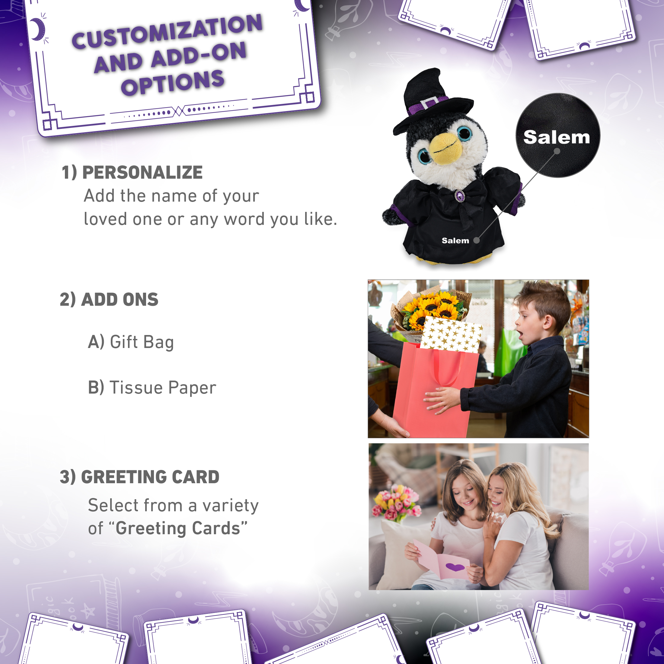 - Personalization, Customization, and Add-On Options – The penguin Halloween plush toy comes dressed in a witch outfit, complete with black and purple cloak and pointy black witch hat. Make your teddy bear doll special by adding a personalized name, which we will imprint onto the plush. You can also customize your witch penguin stuffed animal by adding any of our add-ons to create the perfect gift: 1) Gift Bag 2) Tissue Paper 3) Greeting Card.