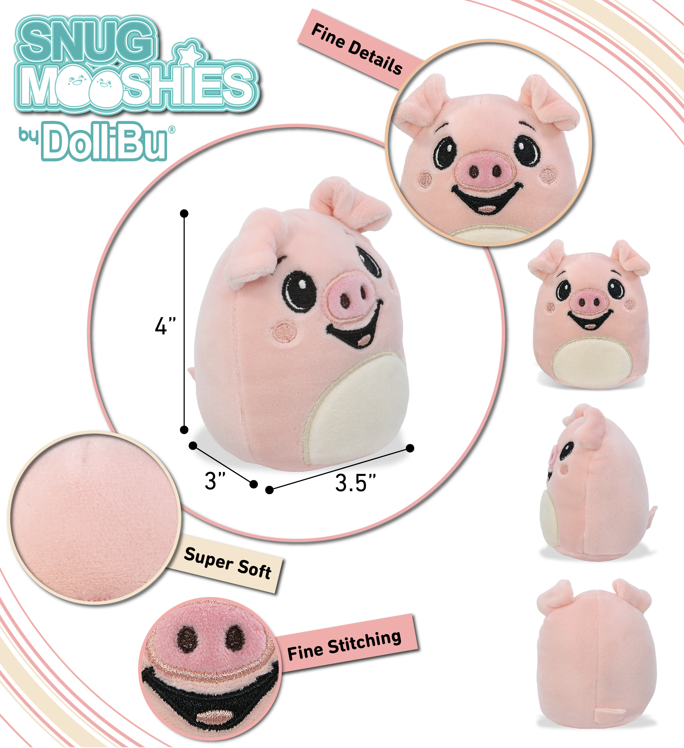 - Included In The Purchase Of Cute Plush Toy Pig – Includes 1 DolliBu Snug-Mooshies Pig with super squishy and soft plush. The pig stuffed animal toy features cute embroidered features like a smiley face and cute ears like the real farm pig animal. The pig’s small size is ideal for hugging, squeezing, and displaying. Designed to be your kid’s favorite plush toy stuffed animal. The Snug-Mooshies cute plush pig measures 3.5Lx3Wx4H inches.